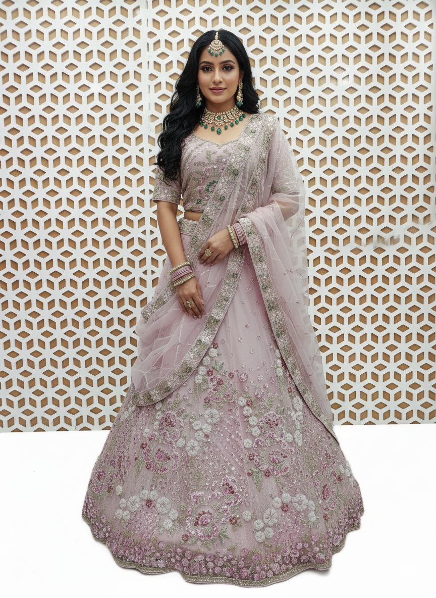 The Baby Pink Bird Embroidery Sequence Work Lehenga is the epitome of refined beauty and modern luxury, perfect for those who want to make a soft yet striking statement at their special events.