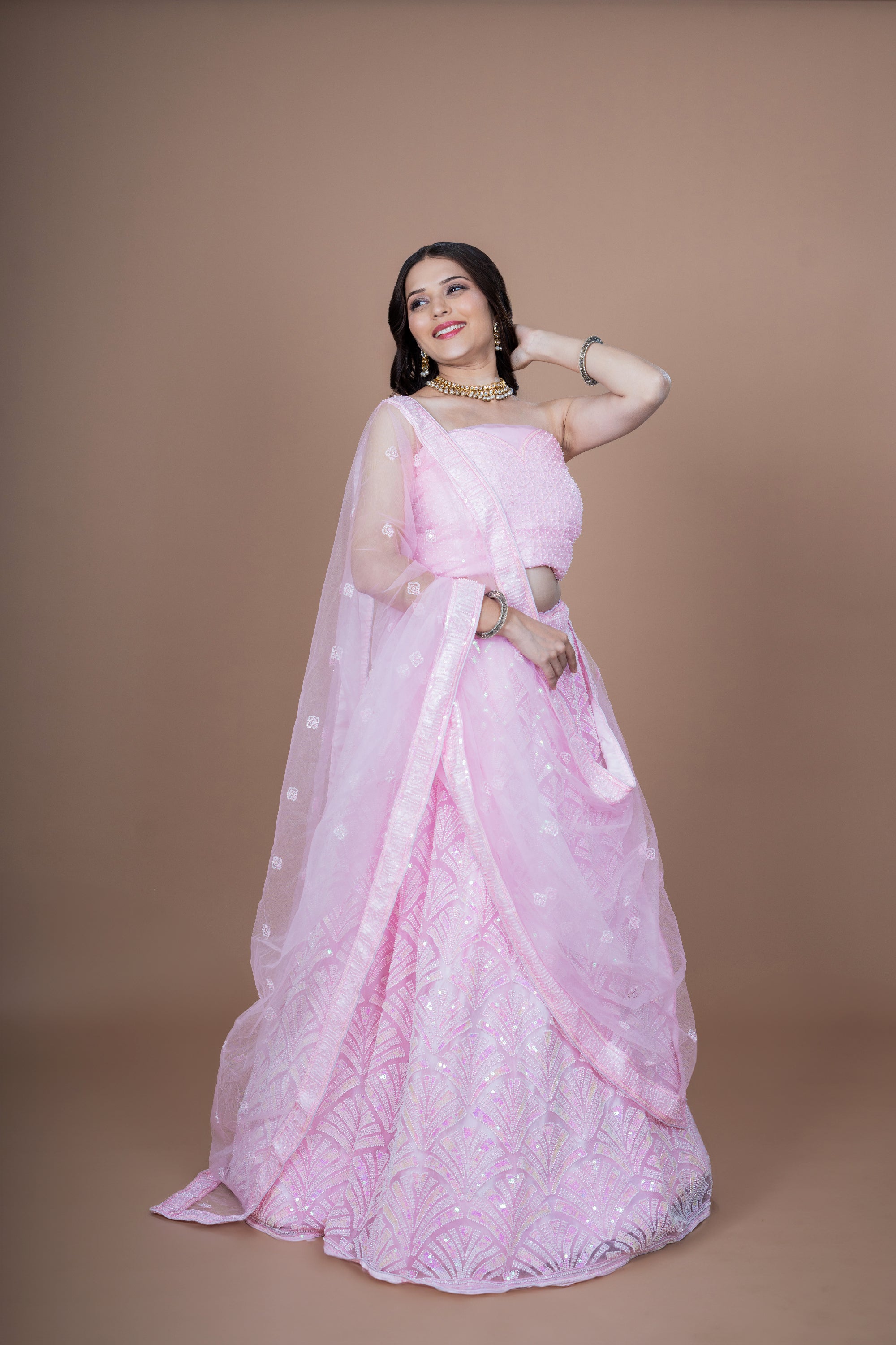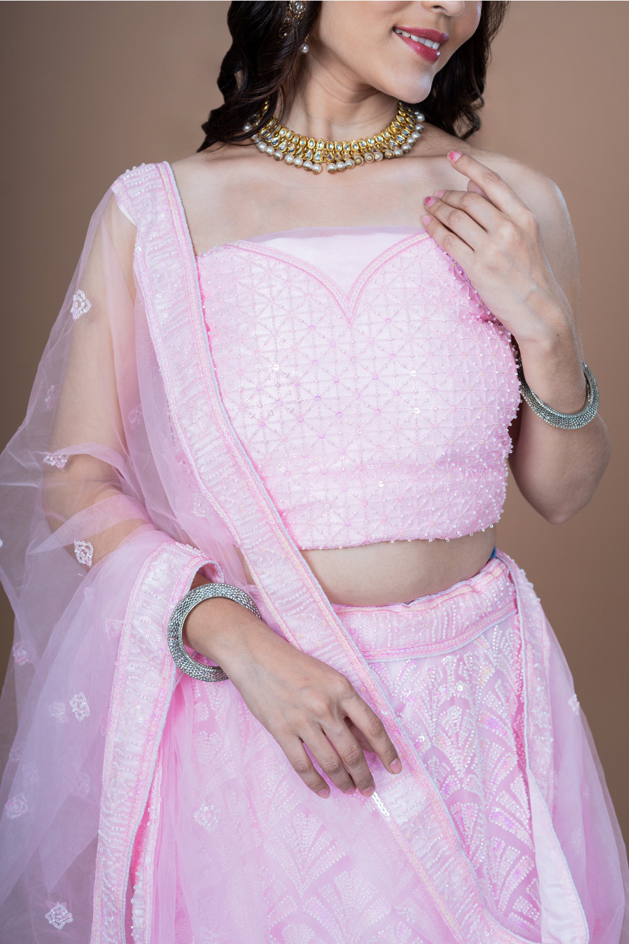 Indulge in the timeless elegance of our Baby Pink Net Moti Hand Work Lehenga set, a masterpiece that exudes sophistication and charm. Crafted with intricate handiwork and adorned with delicate moti embellishments, this lehenga set is a symbol of exquisite craftsmanship. The lehenga, in a soft and soothing baby pink hue, is fashioned from premium quality net fabric, ensuring both comfort and grace with every step. The intricate handwork adds a touch of opulence, making it perfect for special occasions such as weddings, receptions, and festive celebrations. Paired with a complementing dupatta, also intricately adorned with moti work, this ensemble is a captivating choice for those seeking a blend of tradition and contemporary style. The dupatta drapes effortlessly, completing the ensemble with grace and flair.Β