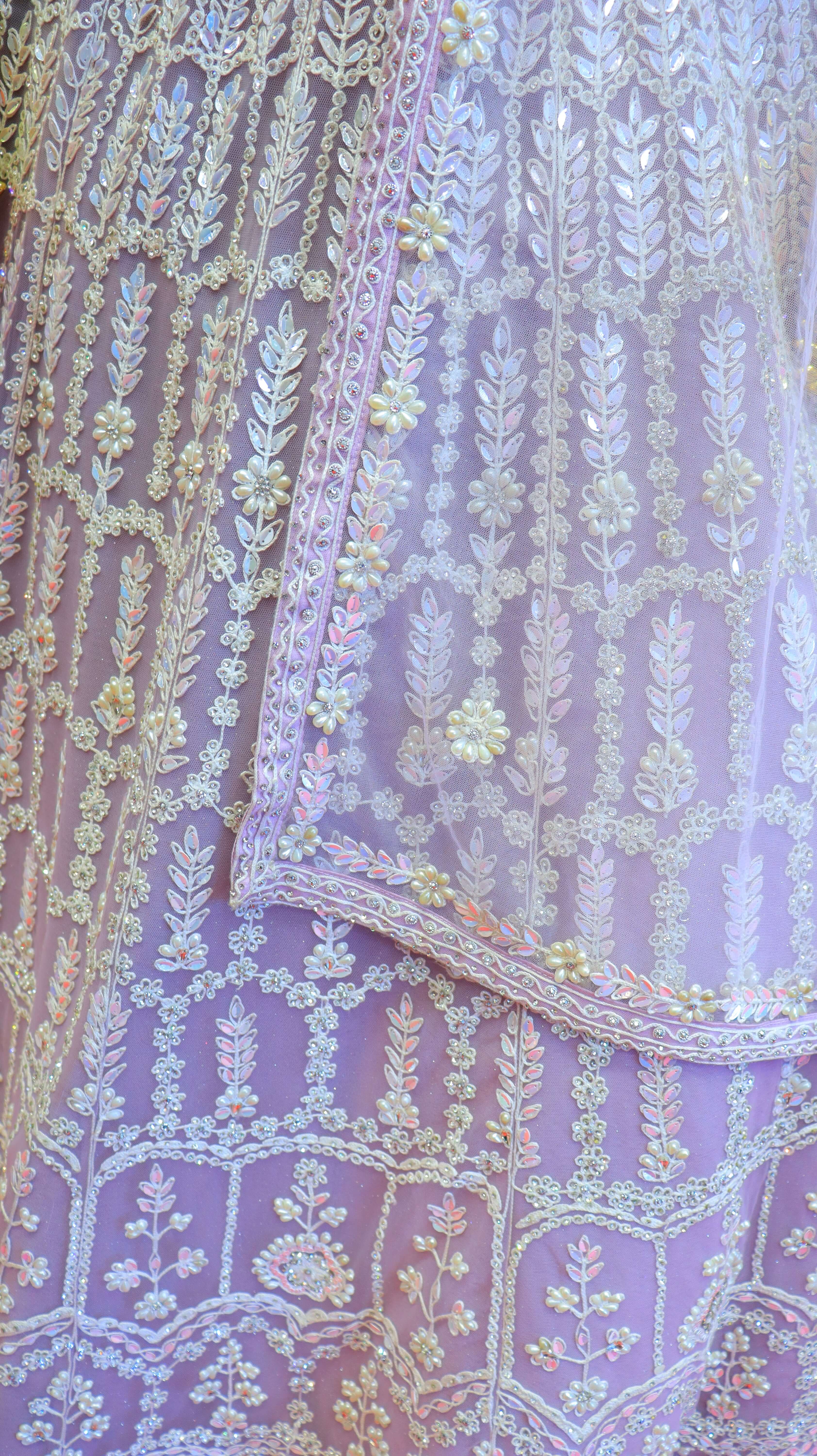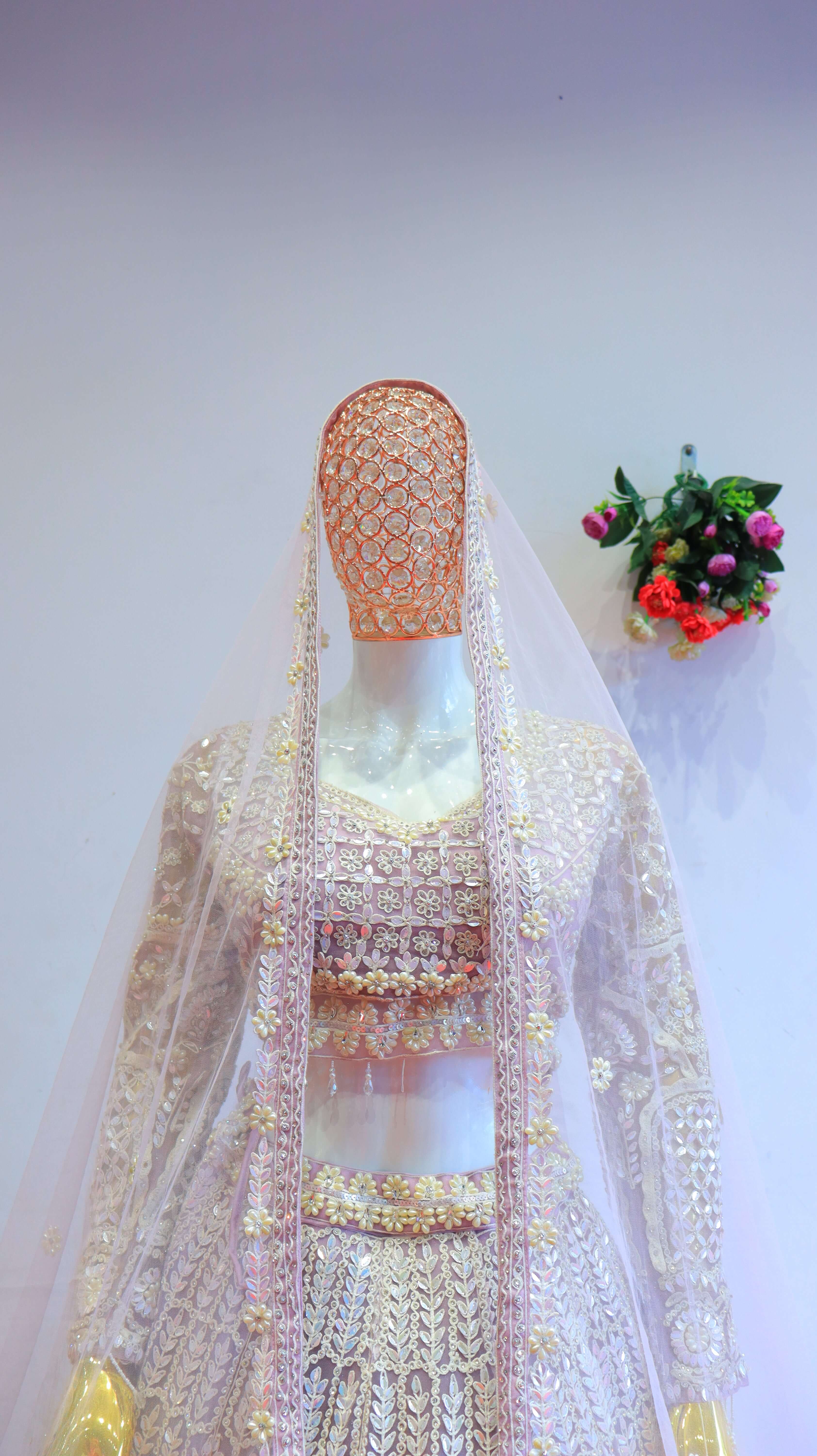 Make an unforgettable impression and embrace the charm of this Beige Net Lehenga with Moti Work – a beautiful creation designed to enhance your elegance on every occasion.