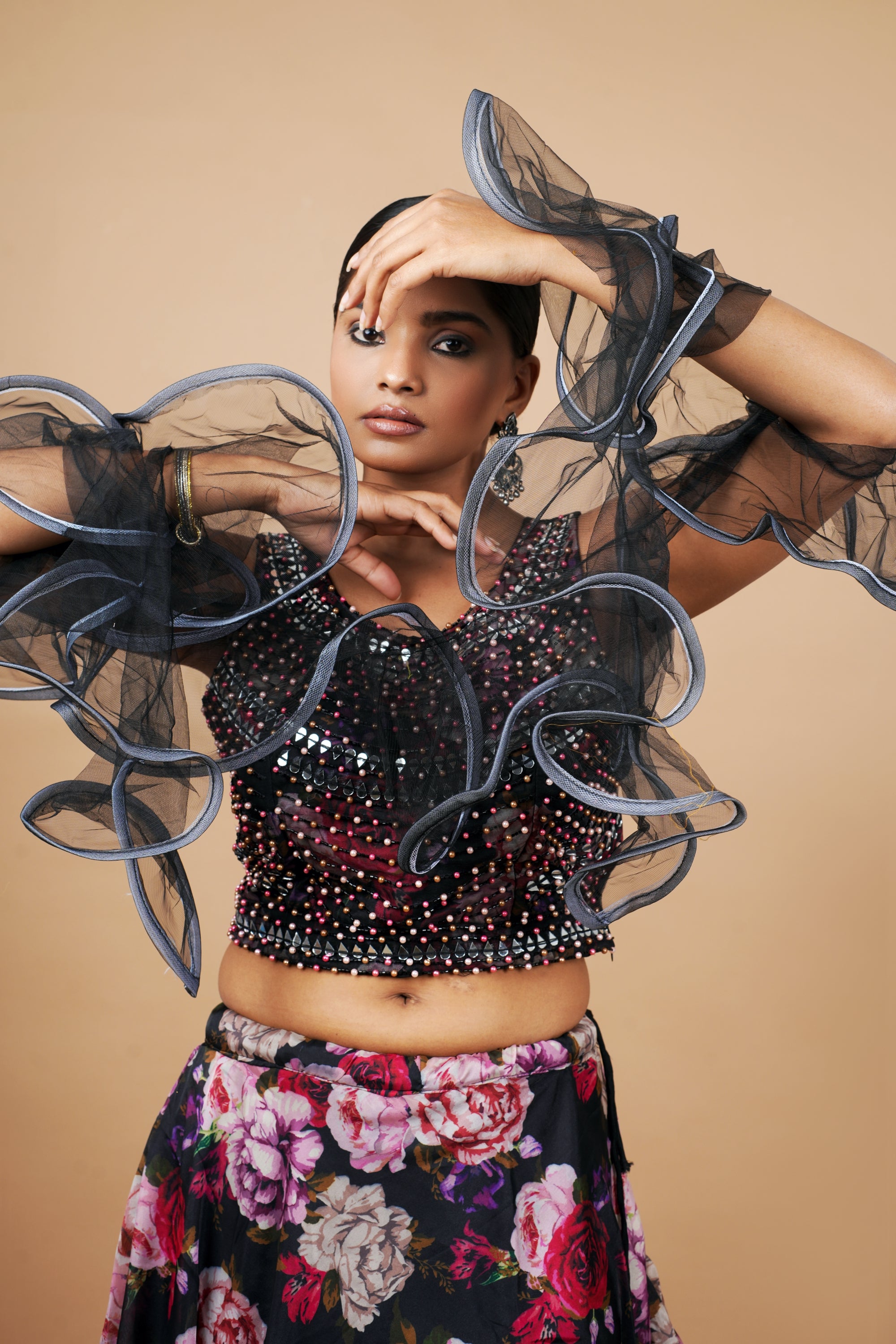 Elevate your wardrobe with our stunning Black Organza Flower Print Crop-Top, featuring exquisite fancy blouse detailing and intricate moti work. Crafted with premium organza fabric, this crop-top boasts a unique flower print design that adds a touch of elegance to any ensemble. The fancy blouse accentuates the top with its intricate craftsmanship, while the meticulous moti work adds a luxurious finish. Perfect for both casual outings and special occasions, this crop-top effortlessly combines style and sophistication. Add a touch of glamour to your wardrobe with our exquisite Black Organza Flower Print Crop-Top.
