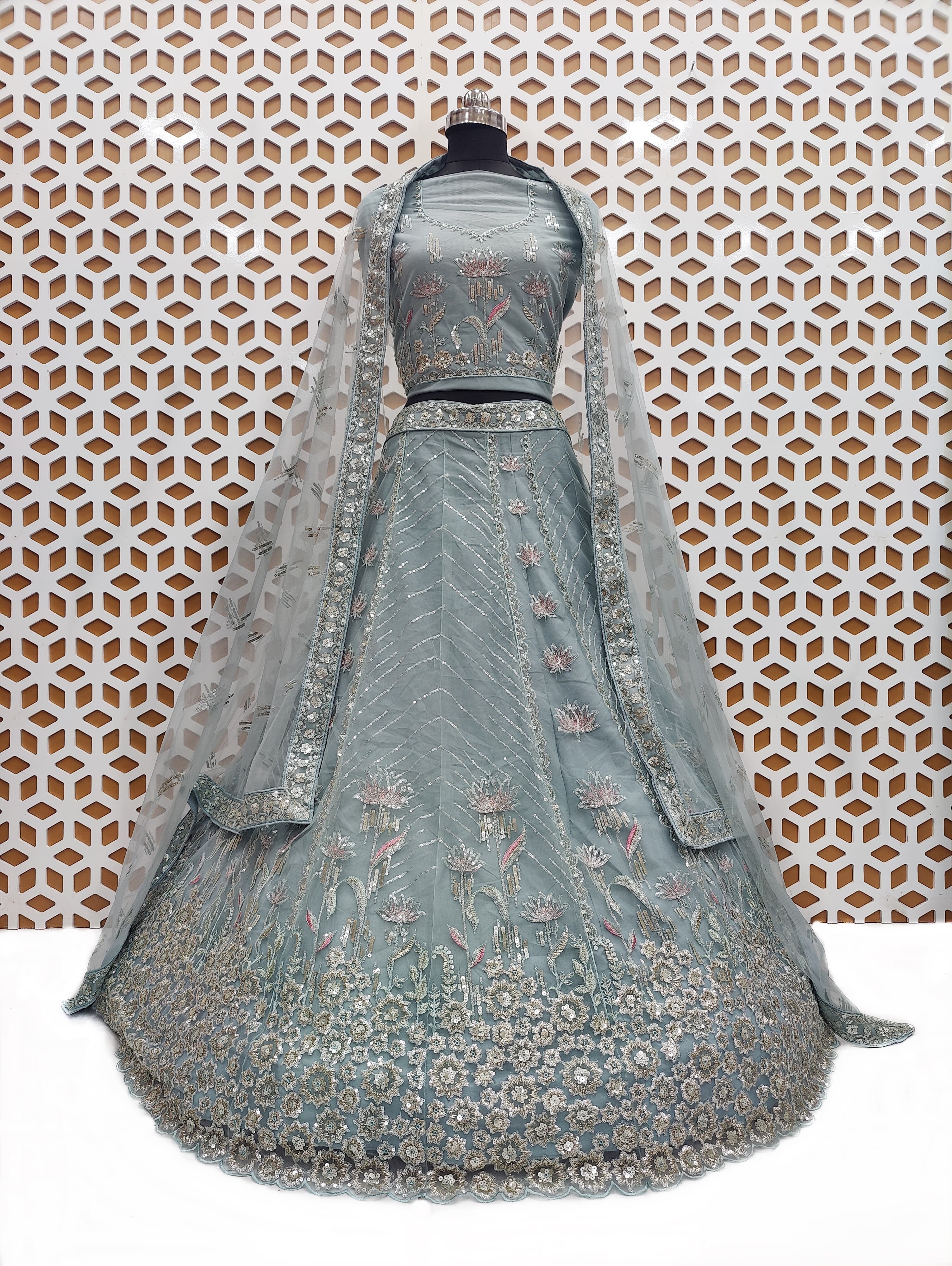 Make a stunning statement at your next celebration with the Glacier Cyan Floral Sequence Work Net Lehenga, and experience elegance like never before.
