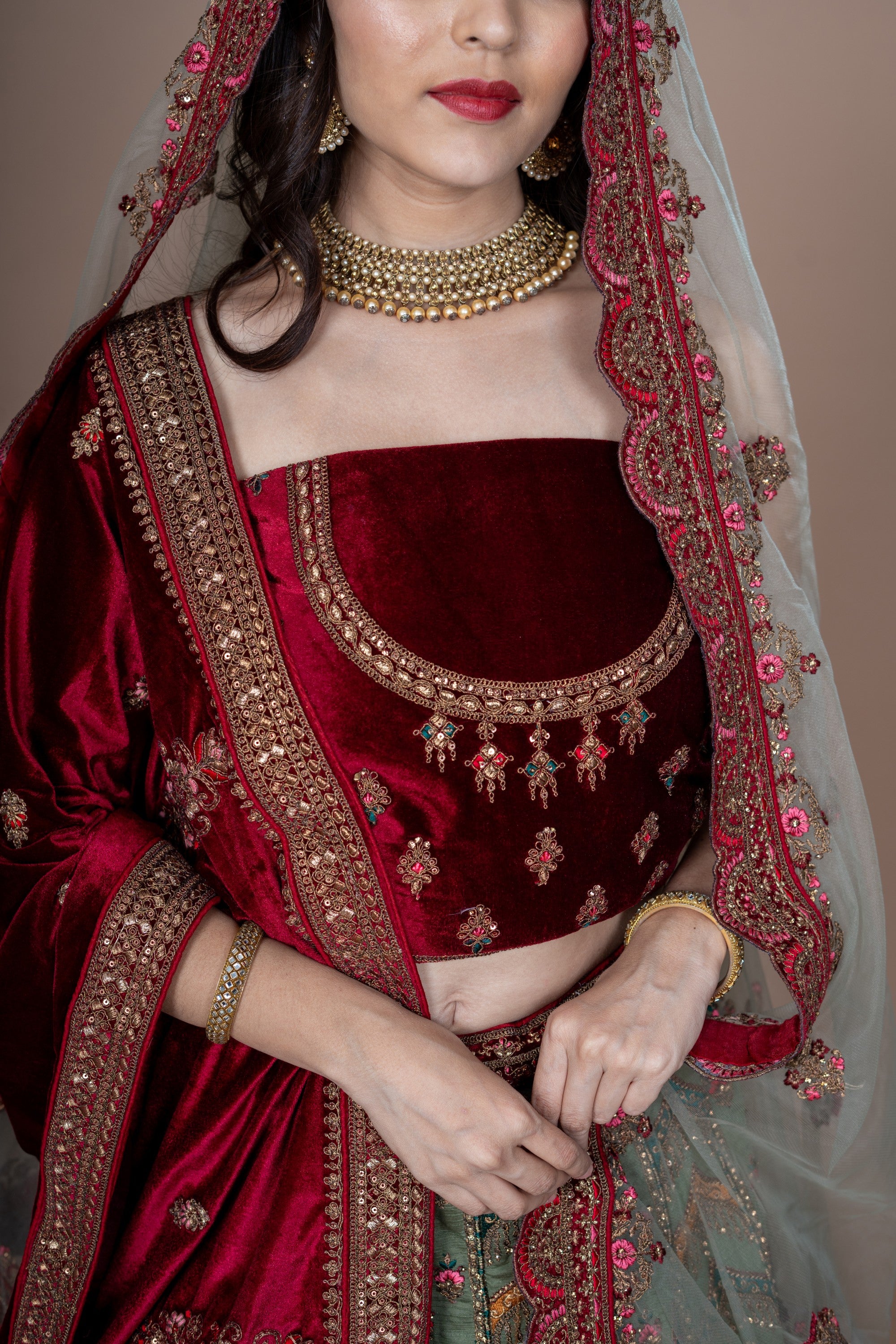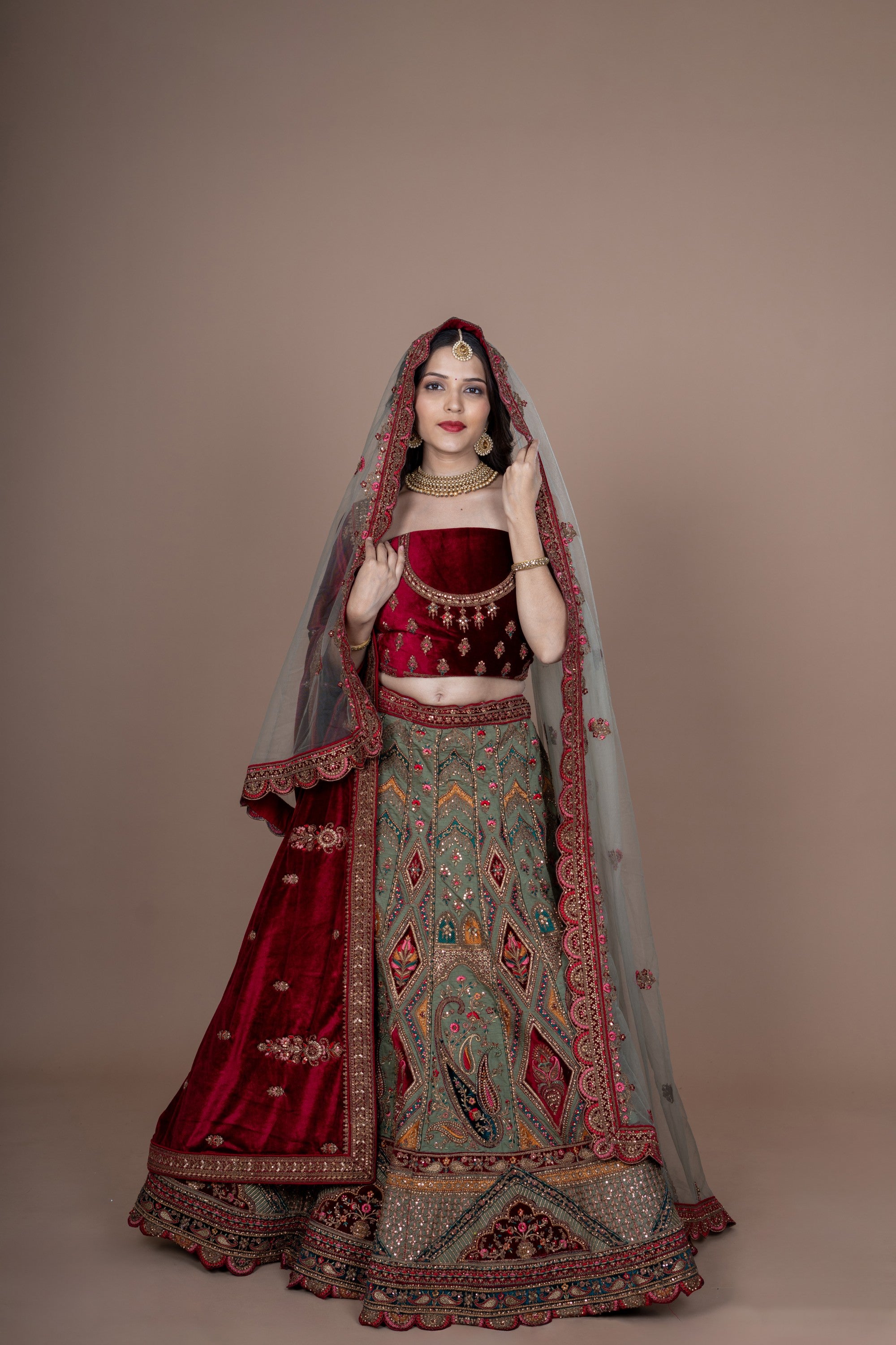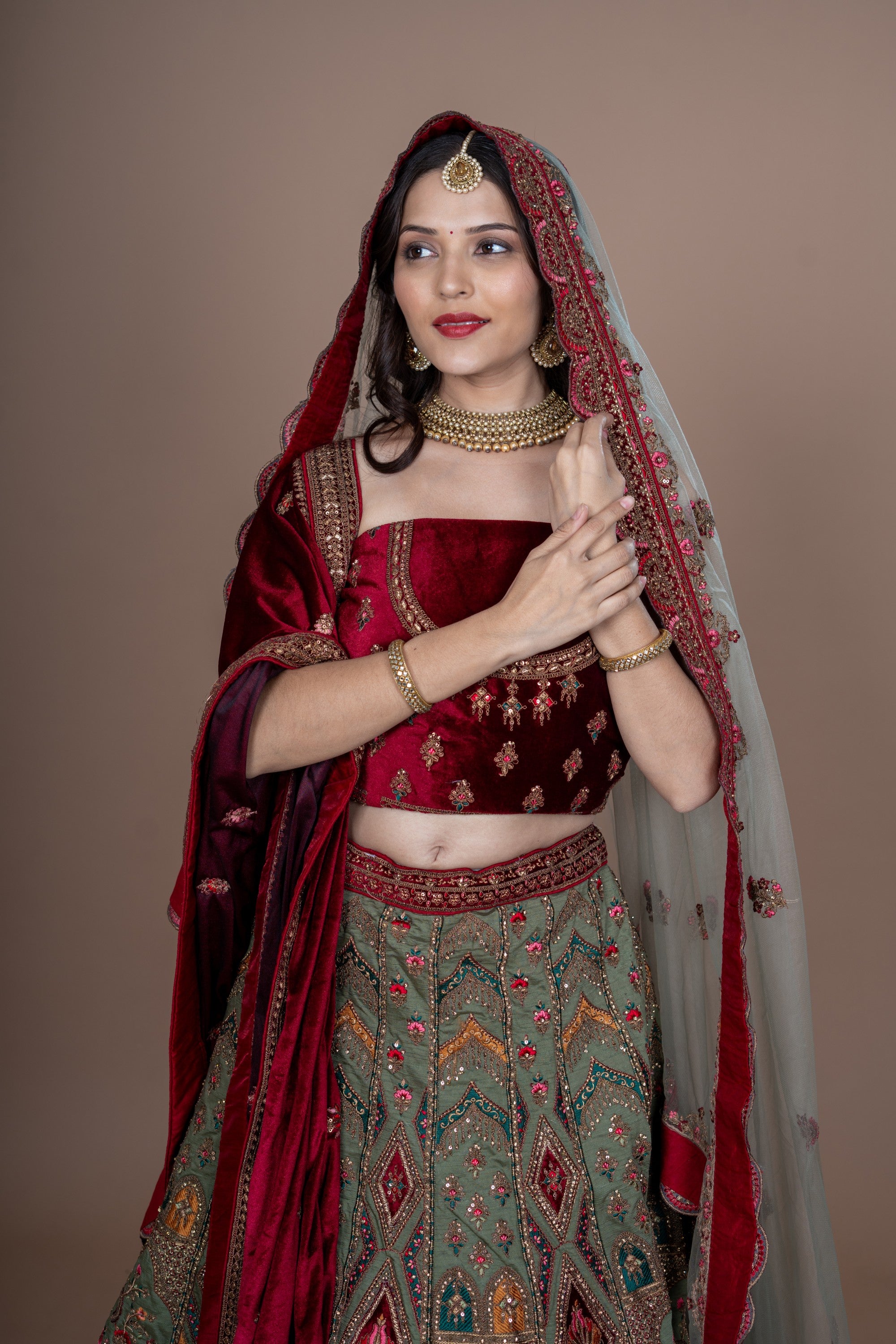Elevate your bridal ensemble with our exquisite Green Silk Embroidery Bridal Lehenga, a timeless masterpiece crafted for the discerning bride. This opulent lehenga features intricate embroidery work, meticulously handcrafted by skilled artisans, adorning the rich silk fabric in verdant hues of green, enhancing its allure and elegance.Designed to make you feel like royalty on your special day, this bridal lehenga exudes sophistication and grace with its regal silhouette and lavish detailing. The luxurious silk fabric drapes flawlessly, accentuating your curves and creating a captivating aura as you glide down the aisle.Complementing the lehenga are two matching dupattas, crafted from the finest silk and adorned with delicate embroidery, adding layers of elegance and charm to your bridal ensemble. Whether draped gracefully over your shoulders or styled in a trendy drape, these dupattas add versatility and flair to your bridal look.