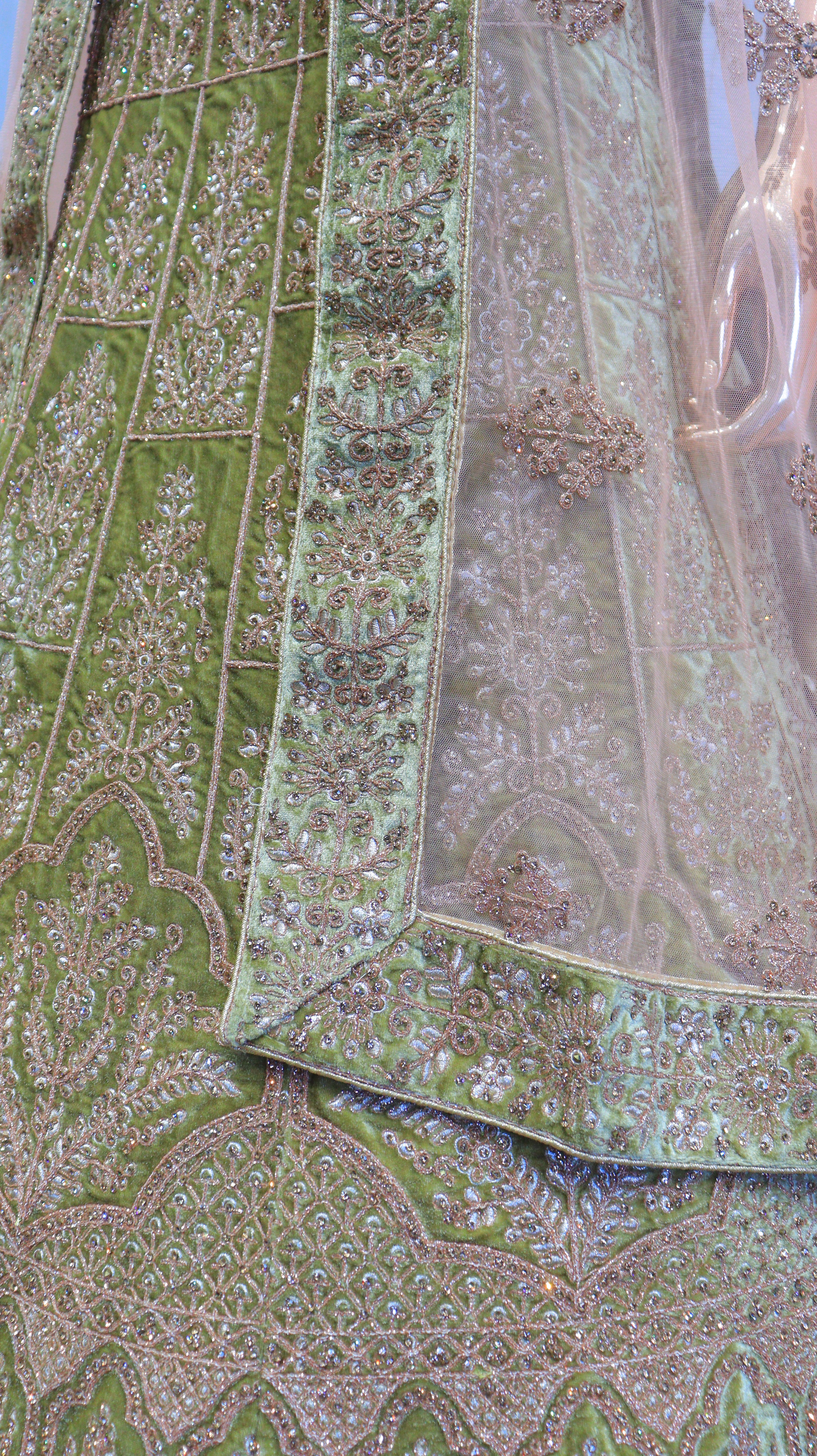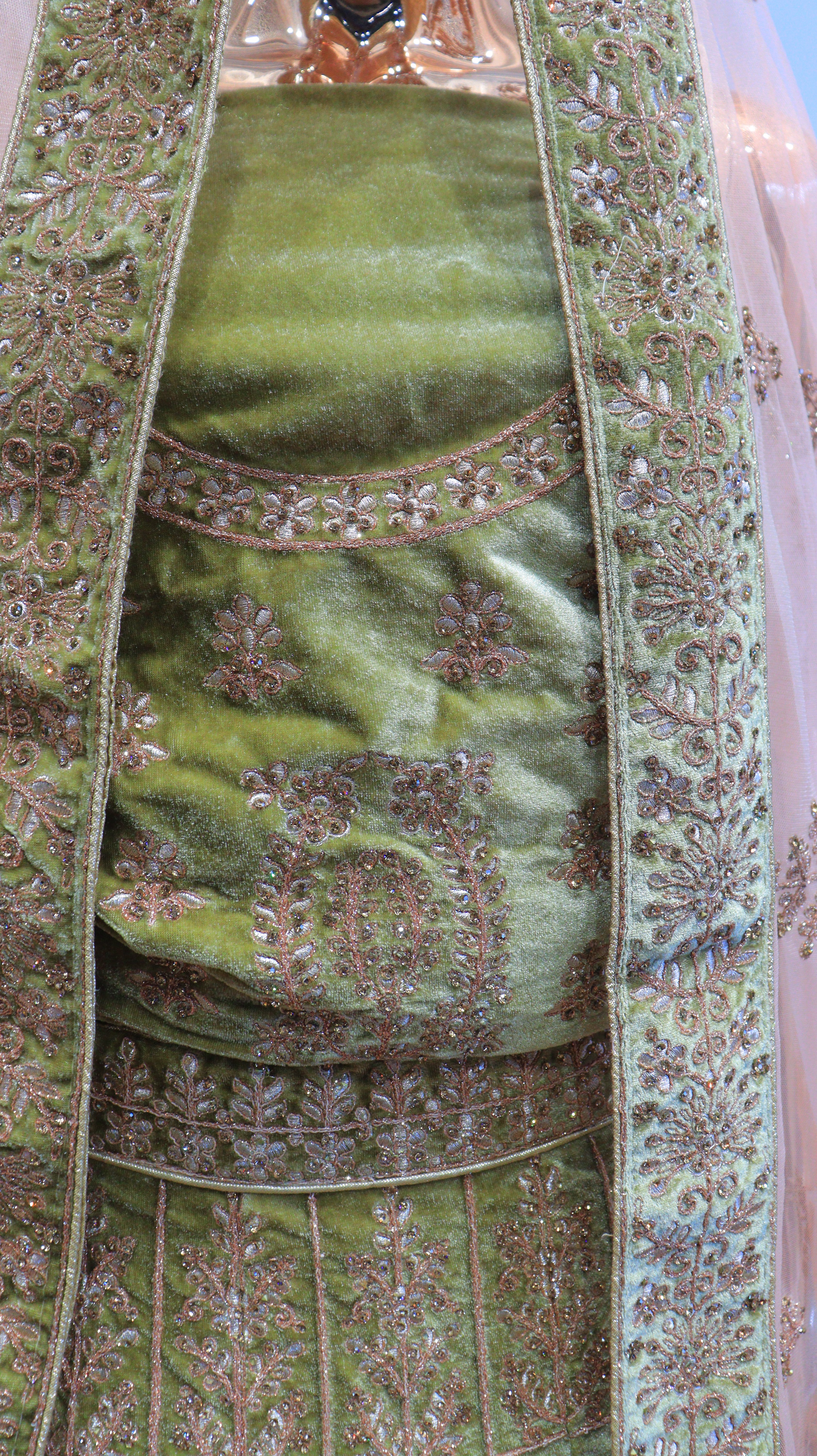 Elevate your ethnic wardrobe with our exquisite Green Velvet Lehenga With Copper Jarkan Work. This luxurious lehenga is crafted from rich velvet fabric, offering a regal look and a soft, comfortable feel. The deep green hue is perfectly complemented by intricate copper jarkan work, which adds a touch of sparkle and sophistication to the ensemble.