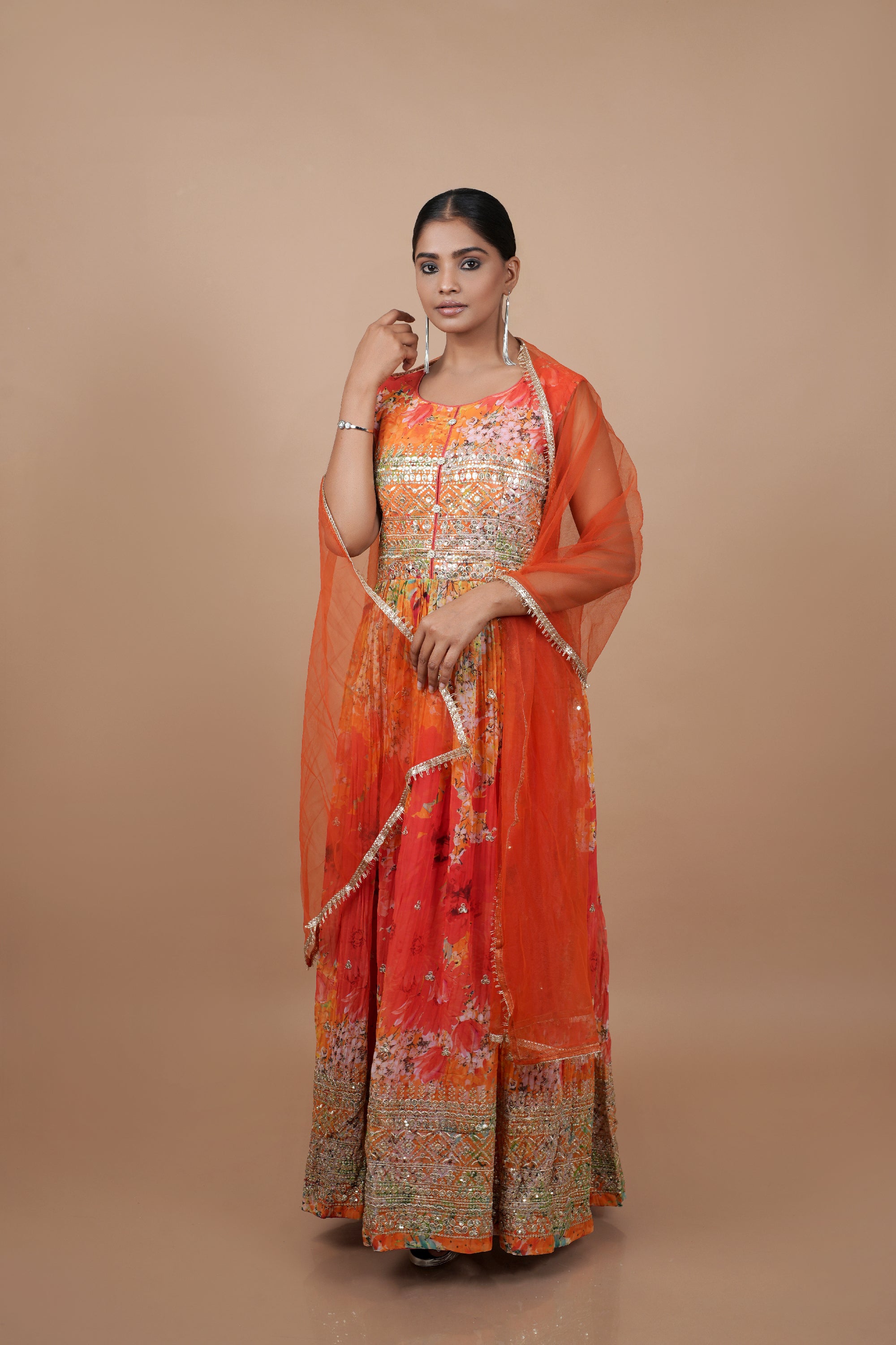 Elevate your style with our stunning Multi Orange Gown featuring exquisite digital prints. This captivating gown blends vibrant hues of orange with intricate digital patterns, creating a mesmerizing visual appeal. Crafted with meticulous attention to detail, this gown boasts a flattering silhouette that accentuates your curves while offering comfort and elegance. Whether it's a gala event, a wedding reception, or a special evening soirée, this gown is sure to make a statement. Embrace sophistication and glamour with our Multi Orange Gown With Digital Print, designed to turn heads and leave a lasting impression.
