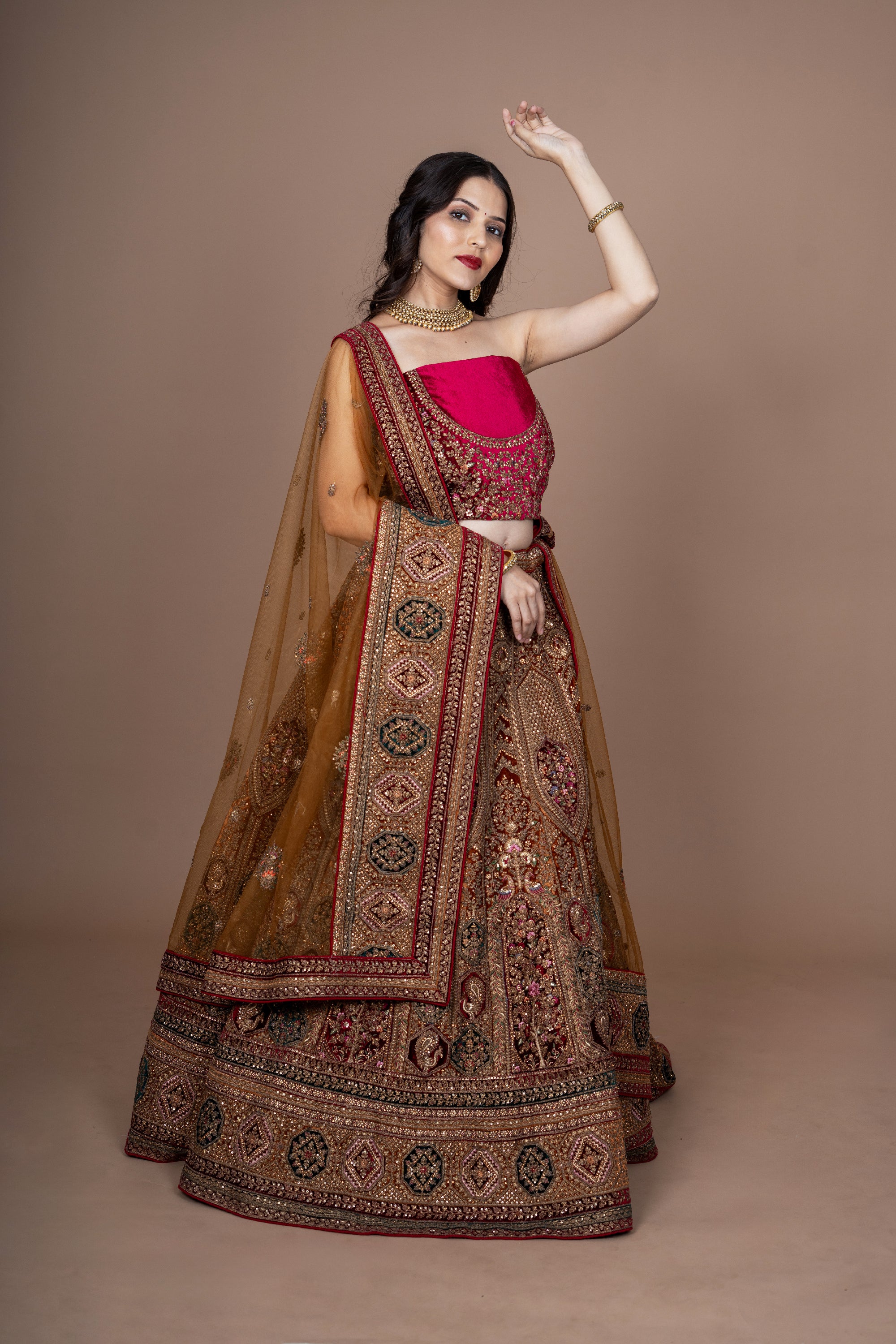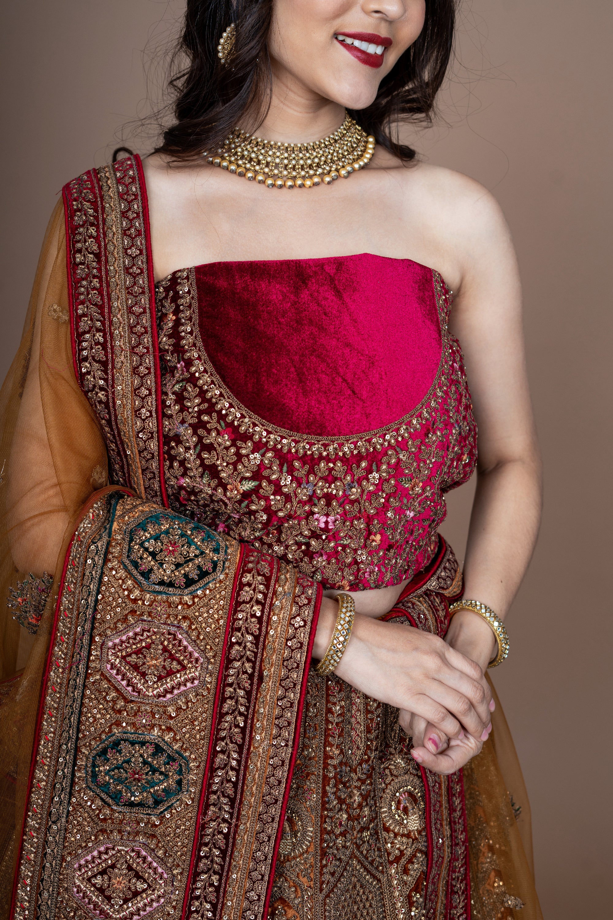 Indulge in opulence with our exquisite Multi Velvet Bridal Lehenga, meticulously crafted to perfection. This resplendent ensemble is adorned with intricate embroidery work, showcasing timeless elegance and sophistication. Crafted from sumptuous velvet fabric, the lehenga exudes luxury and grace, making it the perfect choice for a bride seeking unparalleled glamour on her special day. Each detail of the embroidery is thoughtfully designed to enhance the beauty of the bride, adding a touch of regal charm to her ensemble. Elevate your bridal look with this stunning masterpiece that captures the essence of traditional craftsmanship and modern aesthetics. Experience the allure of tradition and luxury with our Multi Velvet Bridal Lehenga, a true embodiment of timeless beauty and grace.