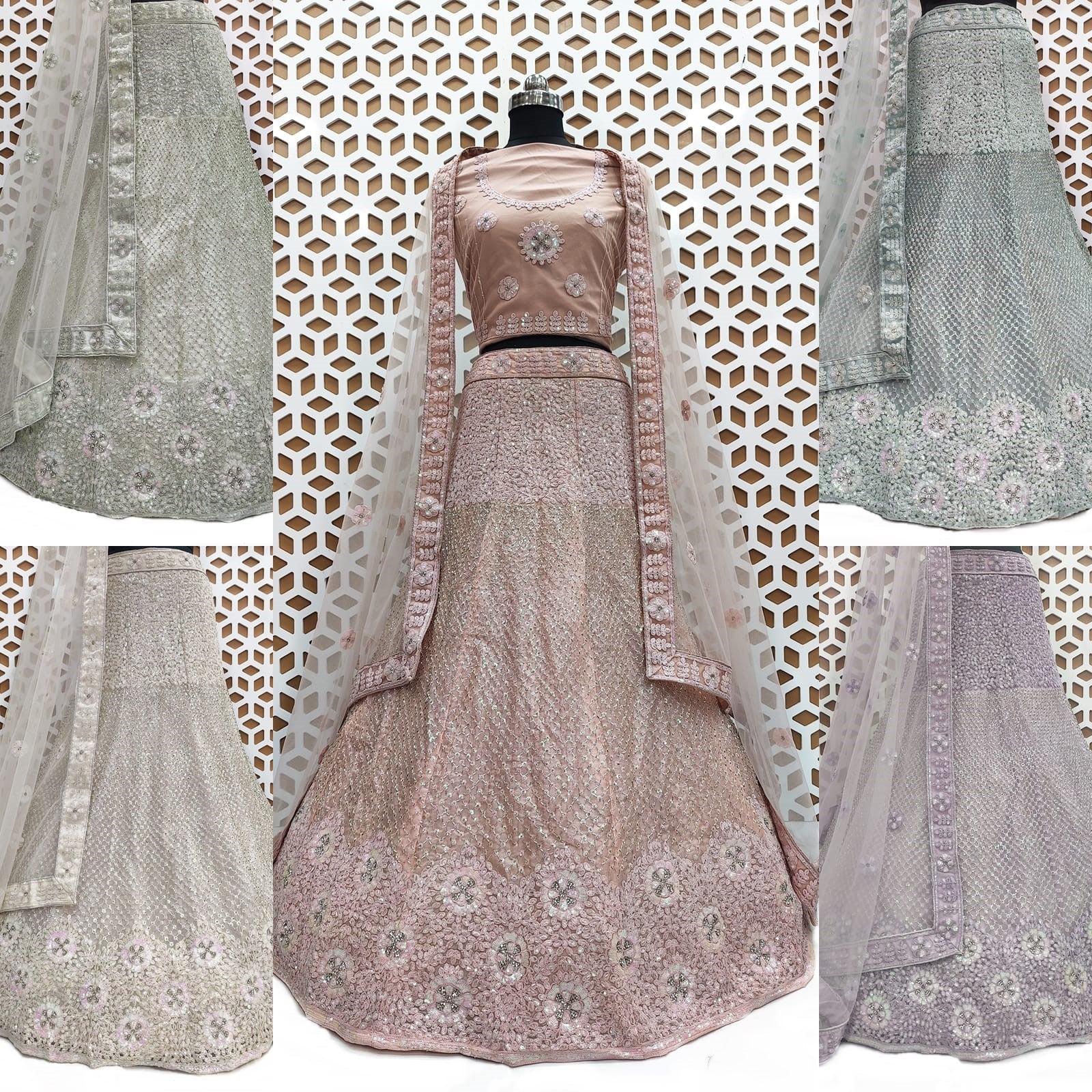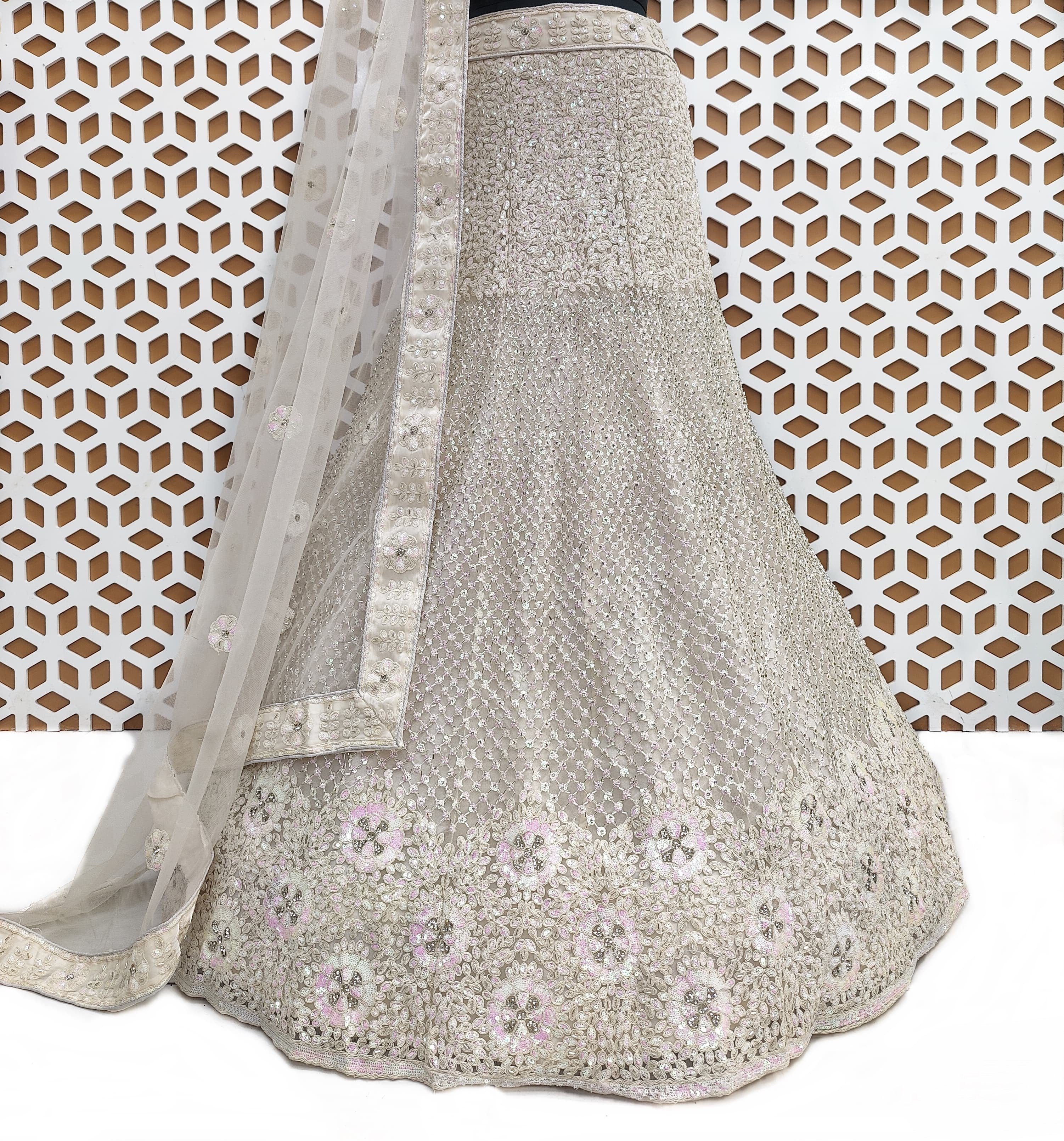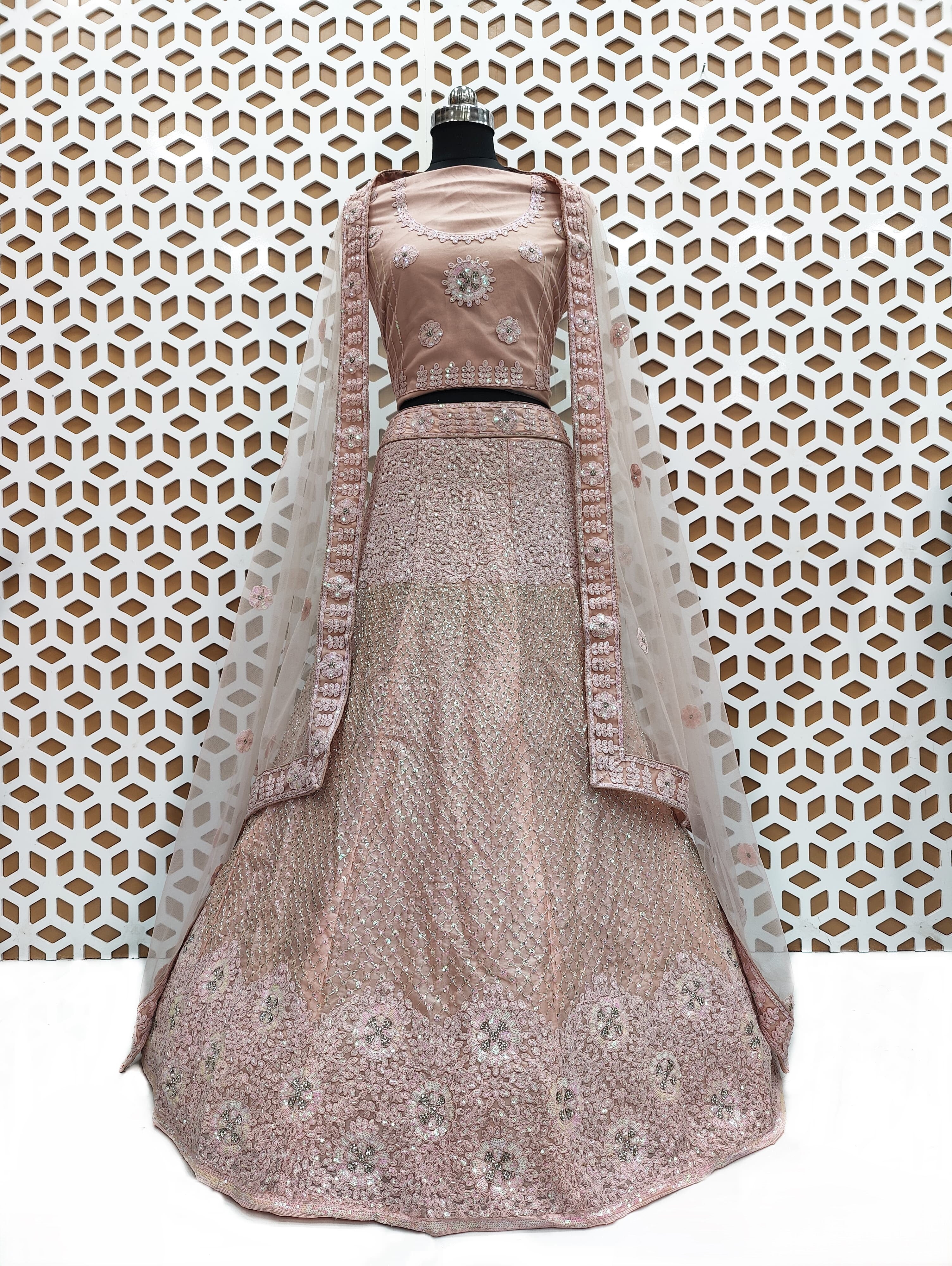 The Malibu Peach Jimmi Choo Net Embroidery Lehenga is a timeless and sophisticated choice, perfect for brides or those seeking to make a luxurious statement at any special event.