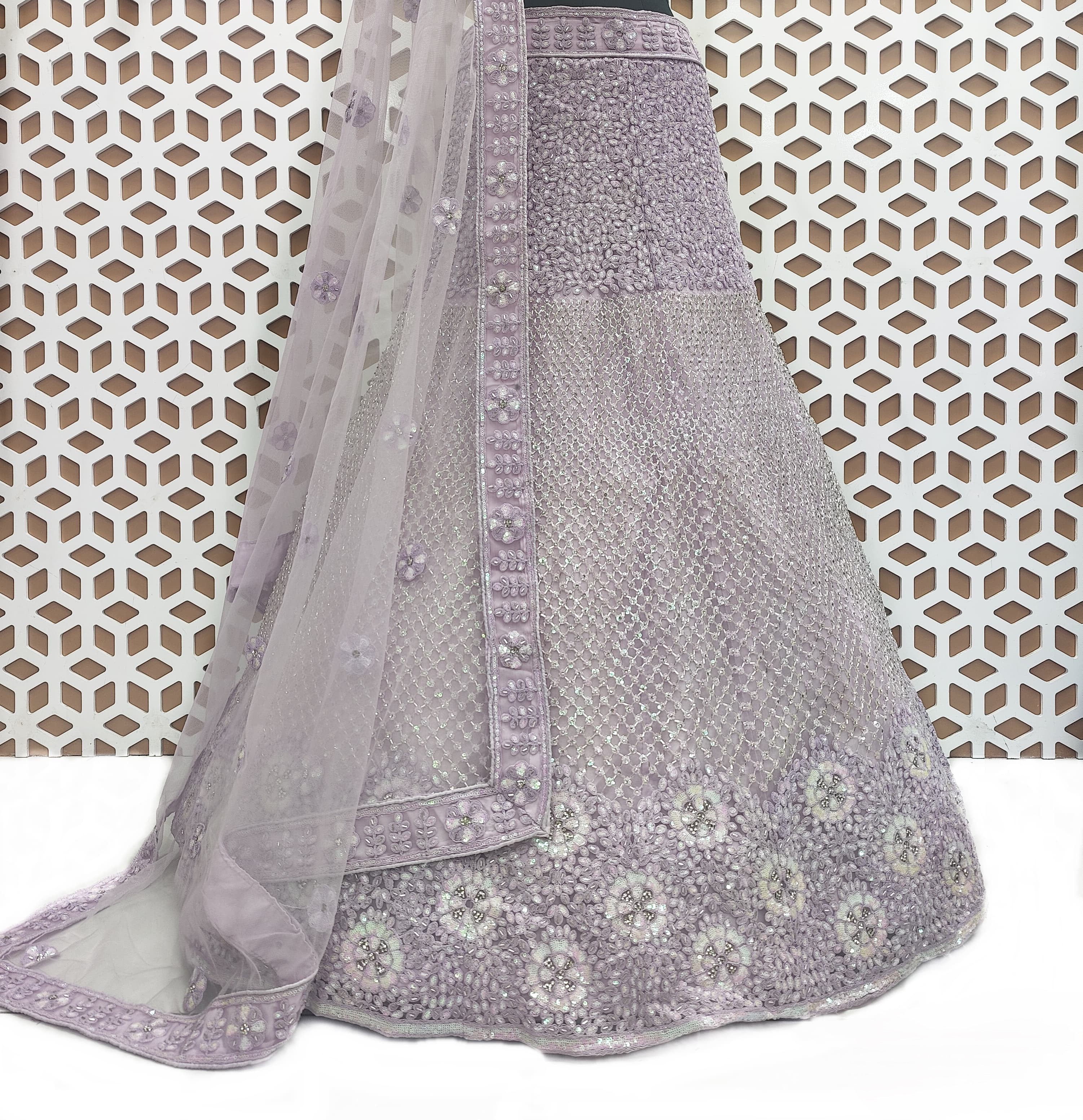The pure white color symbolizes purity and grace, making this lehenga the perfect choice for weddings, receptions, or other grand occasions. Its intricate embroidery showcases a blend of traditional artistry with modern flair, featuring intricate floral patterns and motifs that bring texture and depth to the fabric.