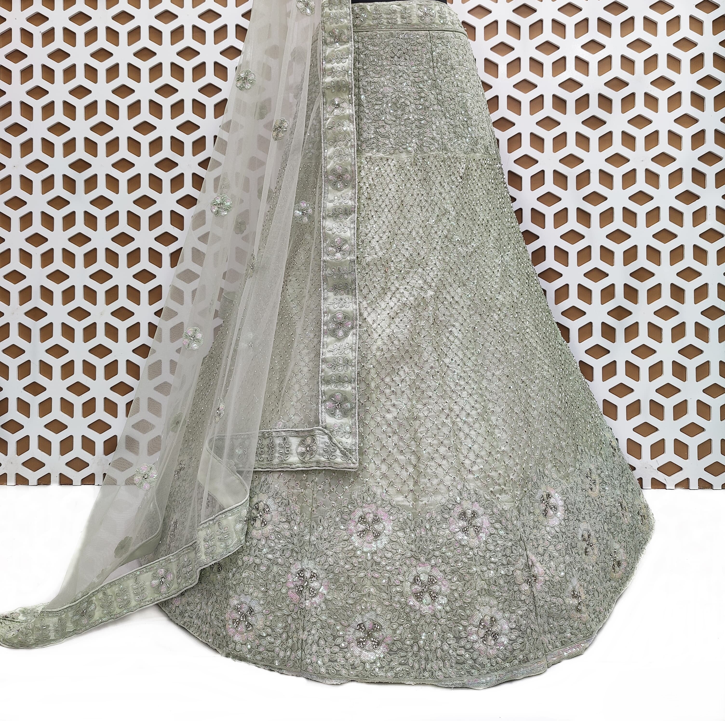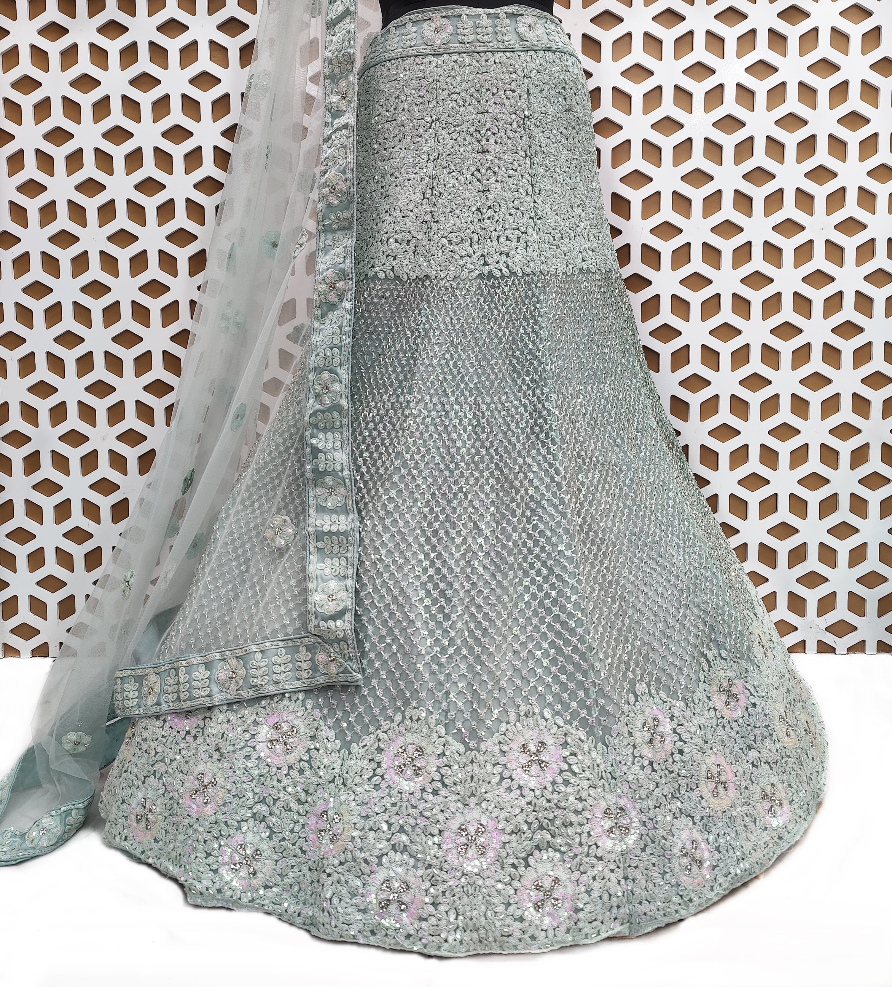 Designed with a flared silhouette, the lehenga enhances your figure while providing an elegant, flowing look that moves beautifully with you. Whether paired with a matching blouse and dupatta or styled with your unique accessories, this lehenga is a true showstopper that will make you shine on your special day.