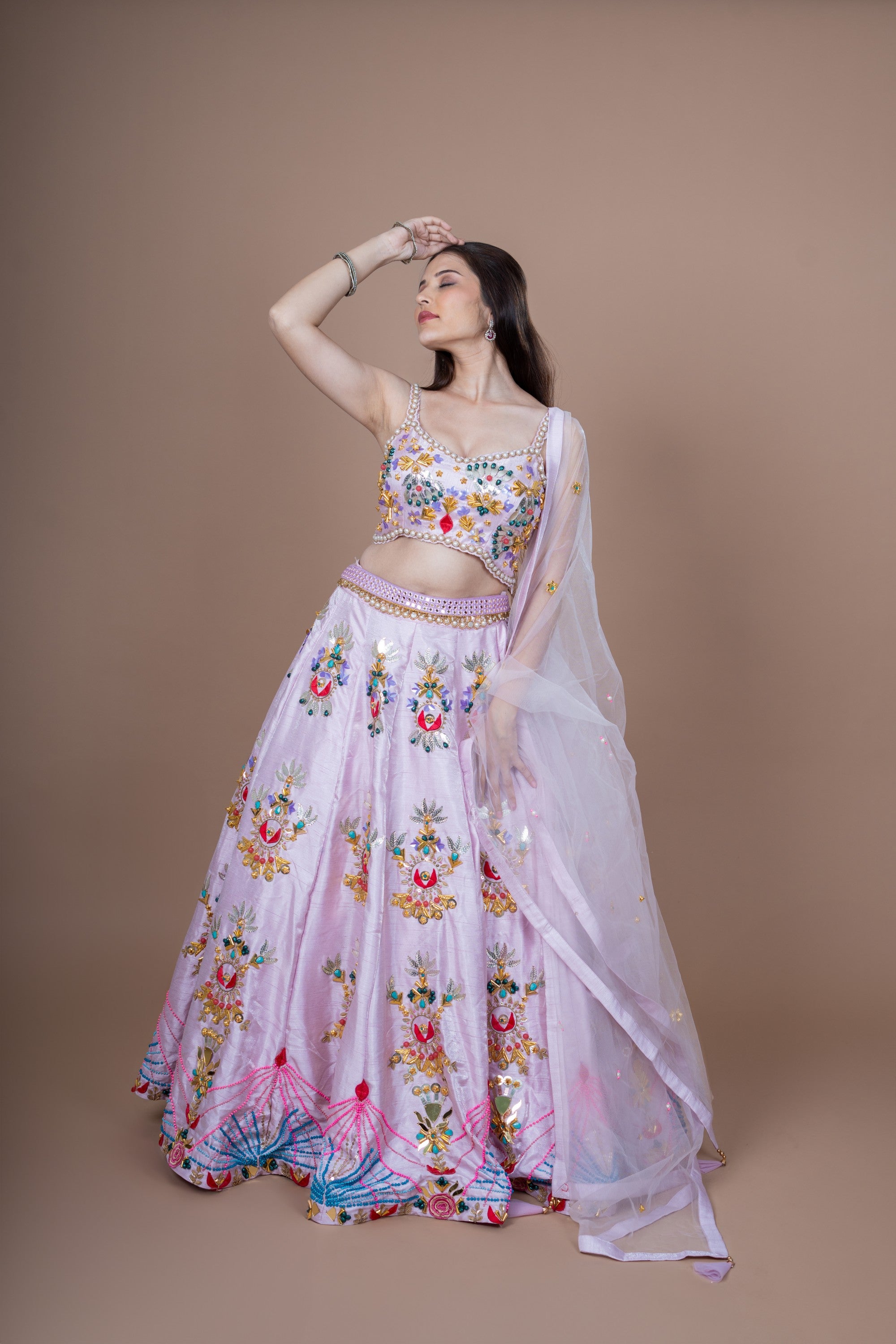 Elevate your wardrobe with our exquisite Pink Silk Crop-Top featuring intricate Kachhi work, meticulously handcrafted to add a touch of elegance and sophistication to your ensemble. Made from luxurious silk fabric, this crop-top offers a seamless blend of comfort and style, perfect for both casual outings and special occasions. The delicate Kachhi work intricately adorns the neckline and sleeves, adding a unique flair and a hint of tradition to your look. Whether paired with high-waisted jeans for a chic daytime look or with a flowing skirt for a glamorous evening affair, this versatile crop-top is sure to make a statement wherever you go. Flaunt your individuality and impeccable taste with our Pink Silk Crop-Top With Kachhi Work, a timeless addition to any fashion-forward wardrobe.