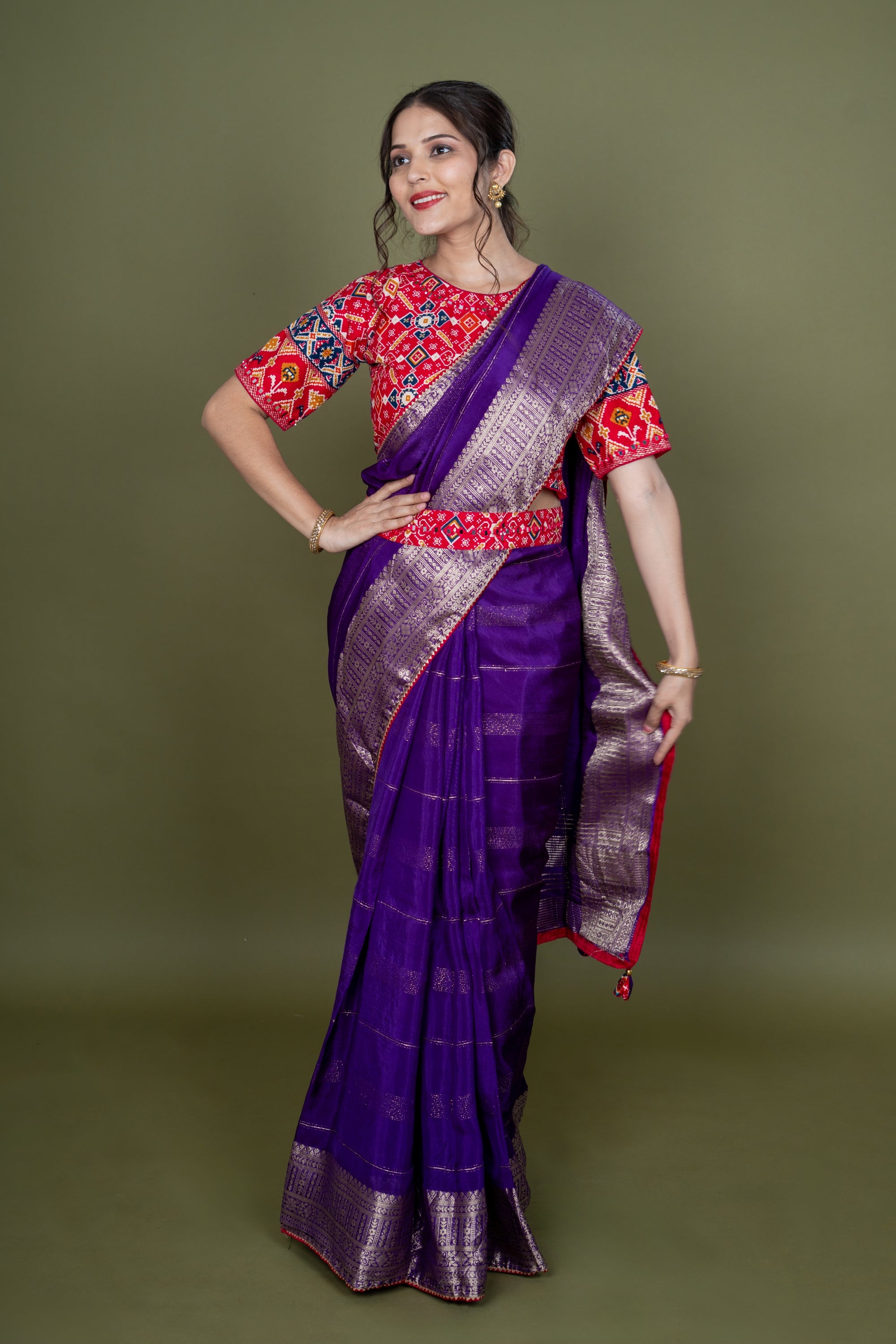 Elevate your ethnic wardrobe with our exquisite Purple Polyester Saree featuring intricate Patola work. Crafted with meticulous attention to detail, this saree seamlessly blends traditional craftsmanship with contemporary elegance. The rich purple hue adds a regal touch, while the intricate Patola work enhances its allure, making it a timeless addition to your collection. Made from high-quality polyester fabric, this saree drapes gracefully, ensuring comfort without compromising on style. Whether it's a festive occasion or a formal event, this saree is sure to make you stand out with its unmatched beauty and charm. Shop now and indulge in the timeless allure of Indian heritage with our Purple Polyester Saree With Patola Work.