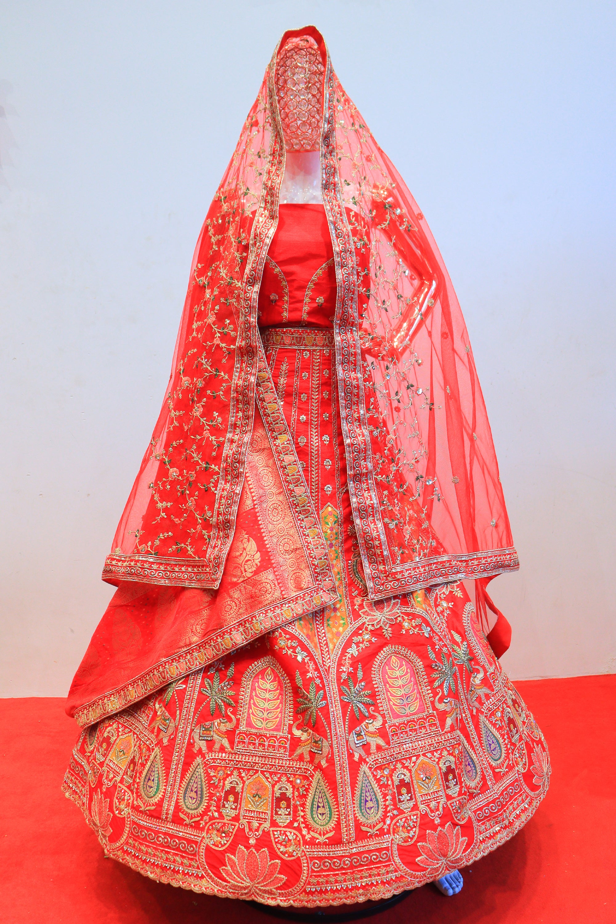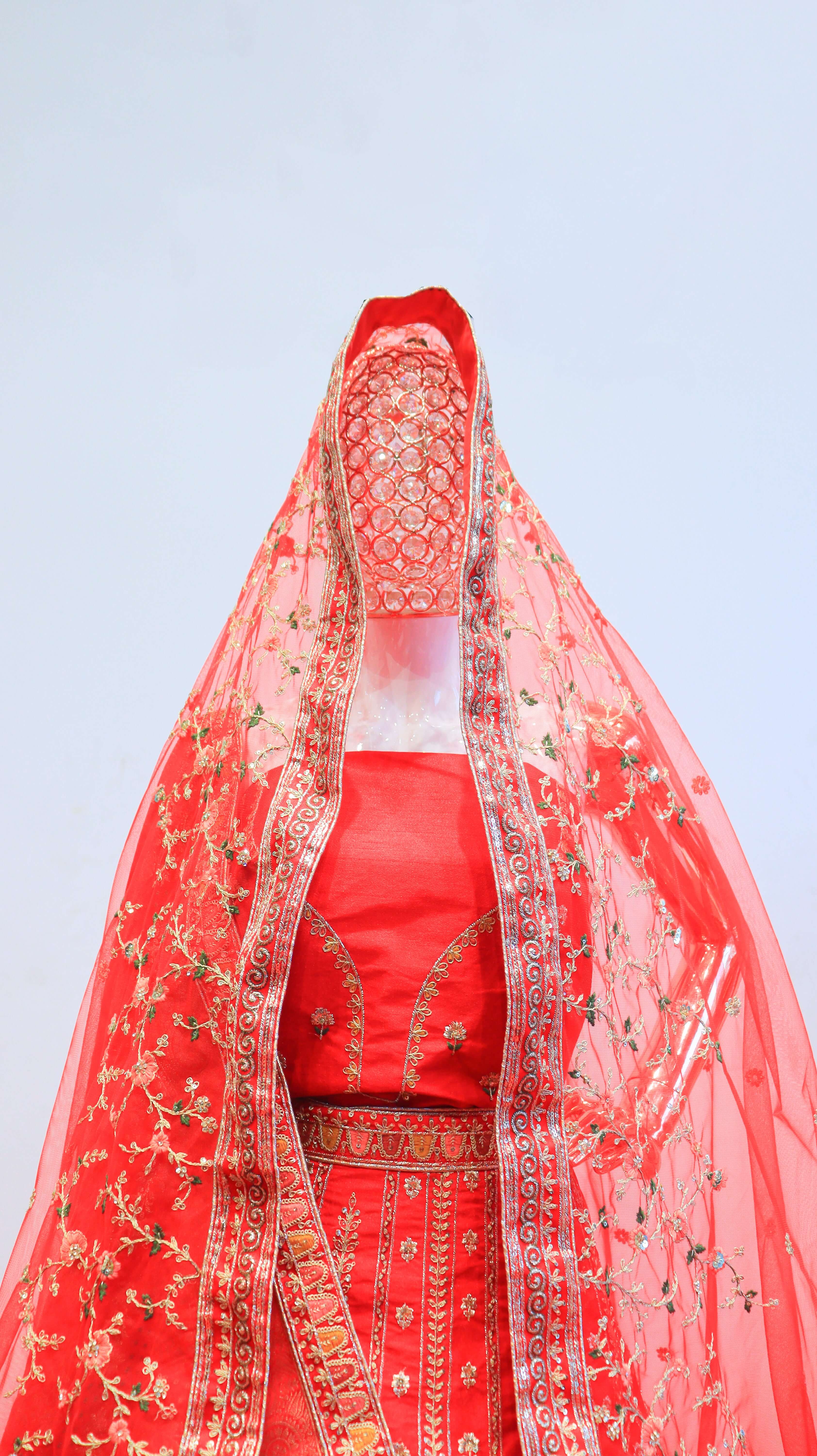 Make a lasting impression and step into your wedding day with unmatched beauty in this Red Bridal Lehenga with Embroidered Design and Sequin Detailing – a symbol of love, luxury, and celebration.