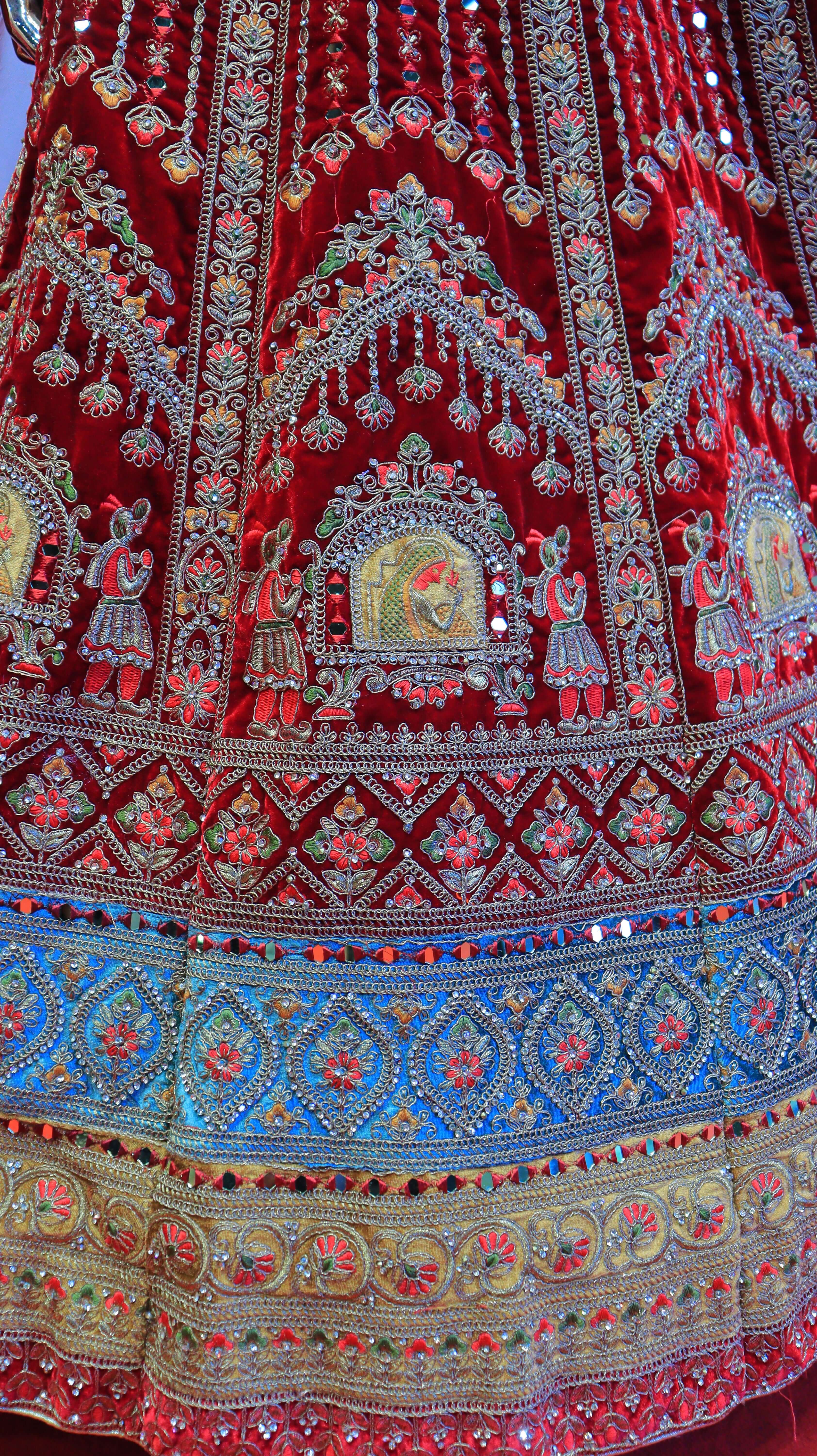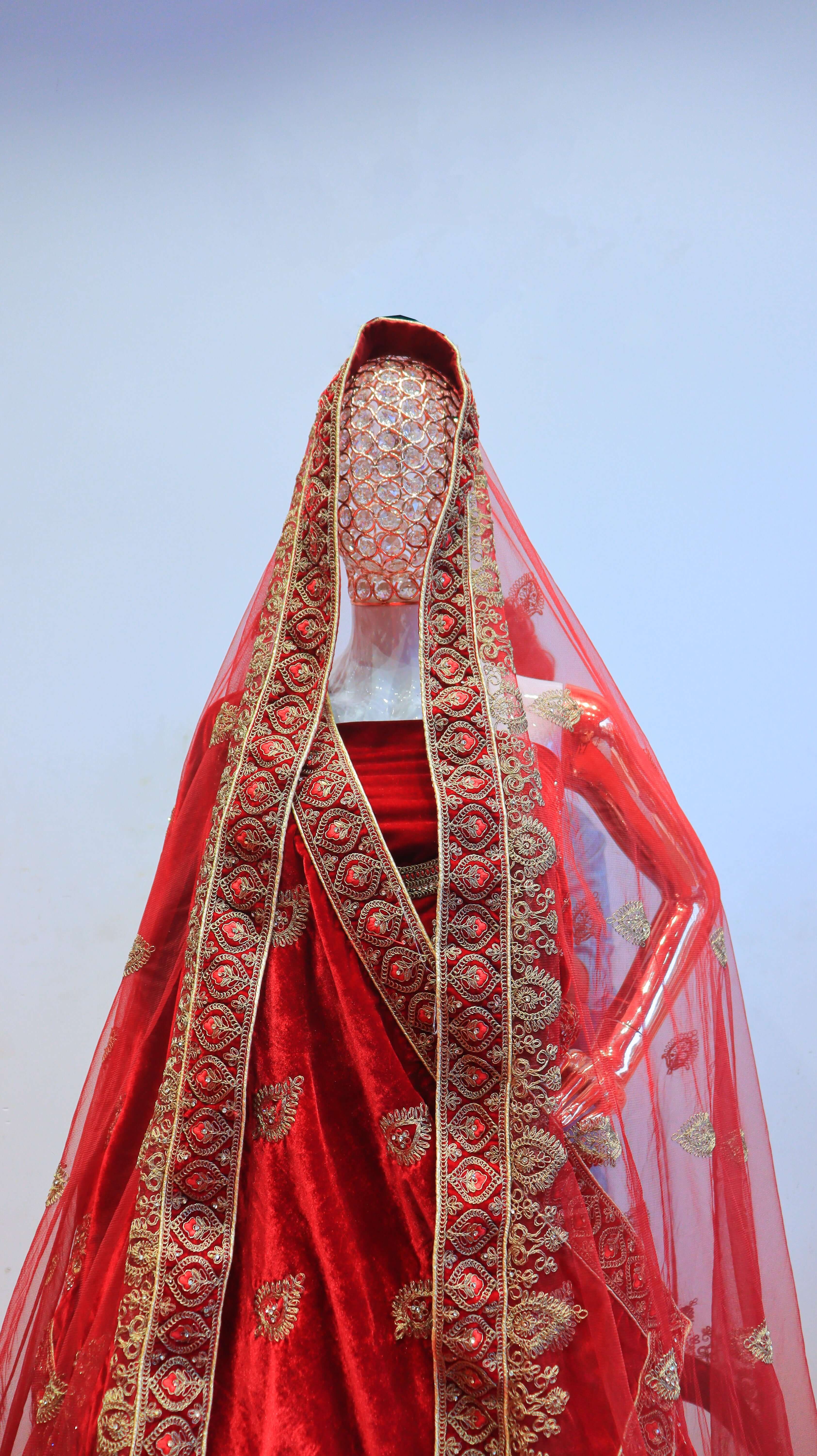 Feel like royalty and embrace the beauty of this Red Velvet Bridal Lehenga with Jari Embroidery – a masterpiece designed to make your wedding day unforgettable.