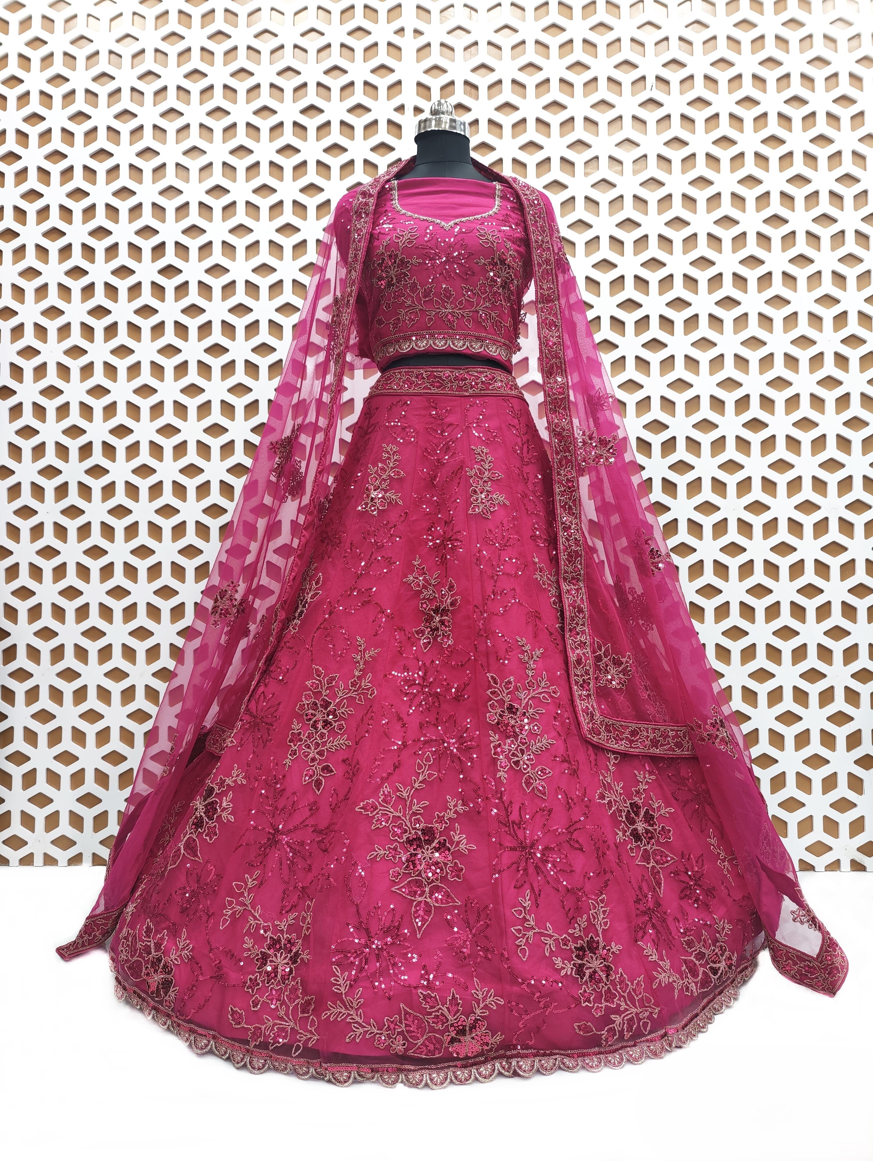 Crafted from premium net fabric, this lehenga offers a lightweight, breathable feel, ensuring comfort while maintaining its graceful flow. The flared silhouette adds volume and movement, allowing for a flattering, feminine shape that moves effortlessly with you.