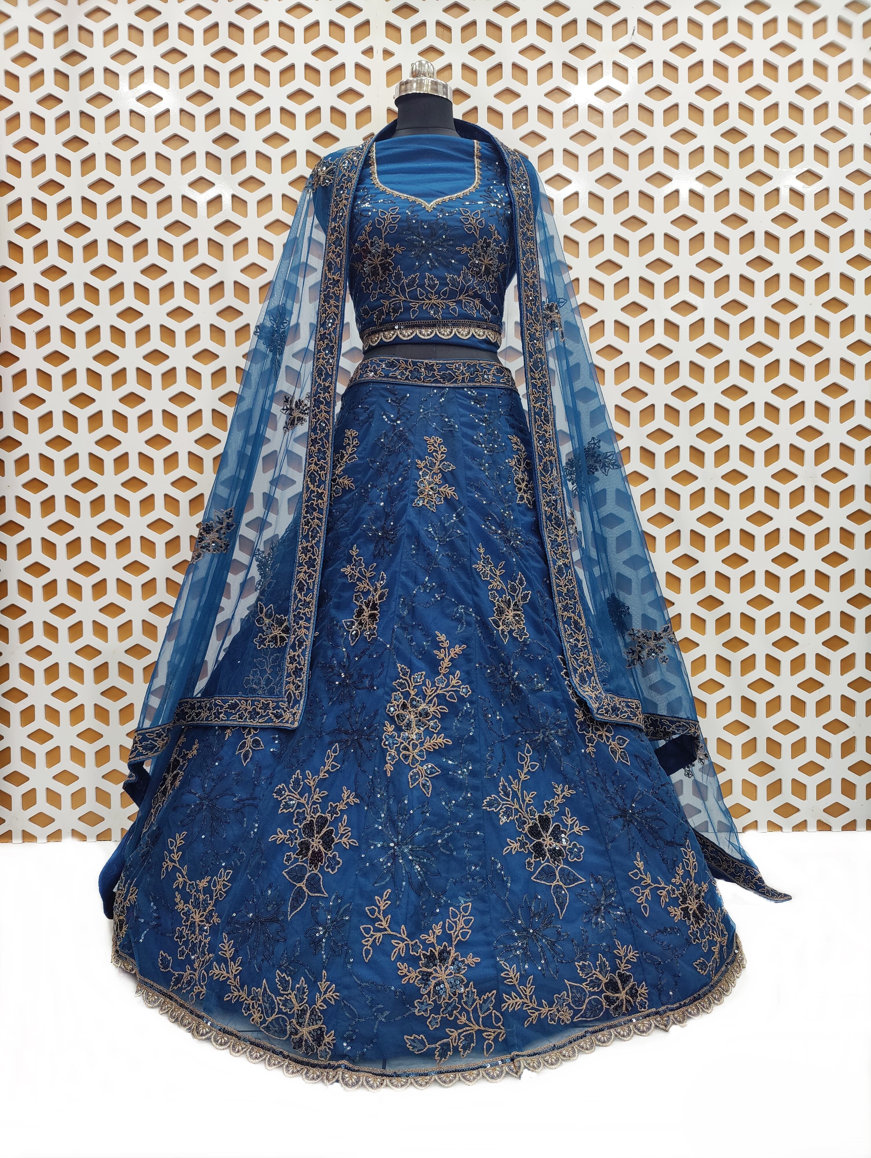 The Royal Blue Thread Sequence Work Net Lehenga is a stunning blend of rich color, intricate detailing, and modern glamour, making it the perfect choice for those looking to make a bold and unforgettable statement.