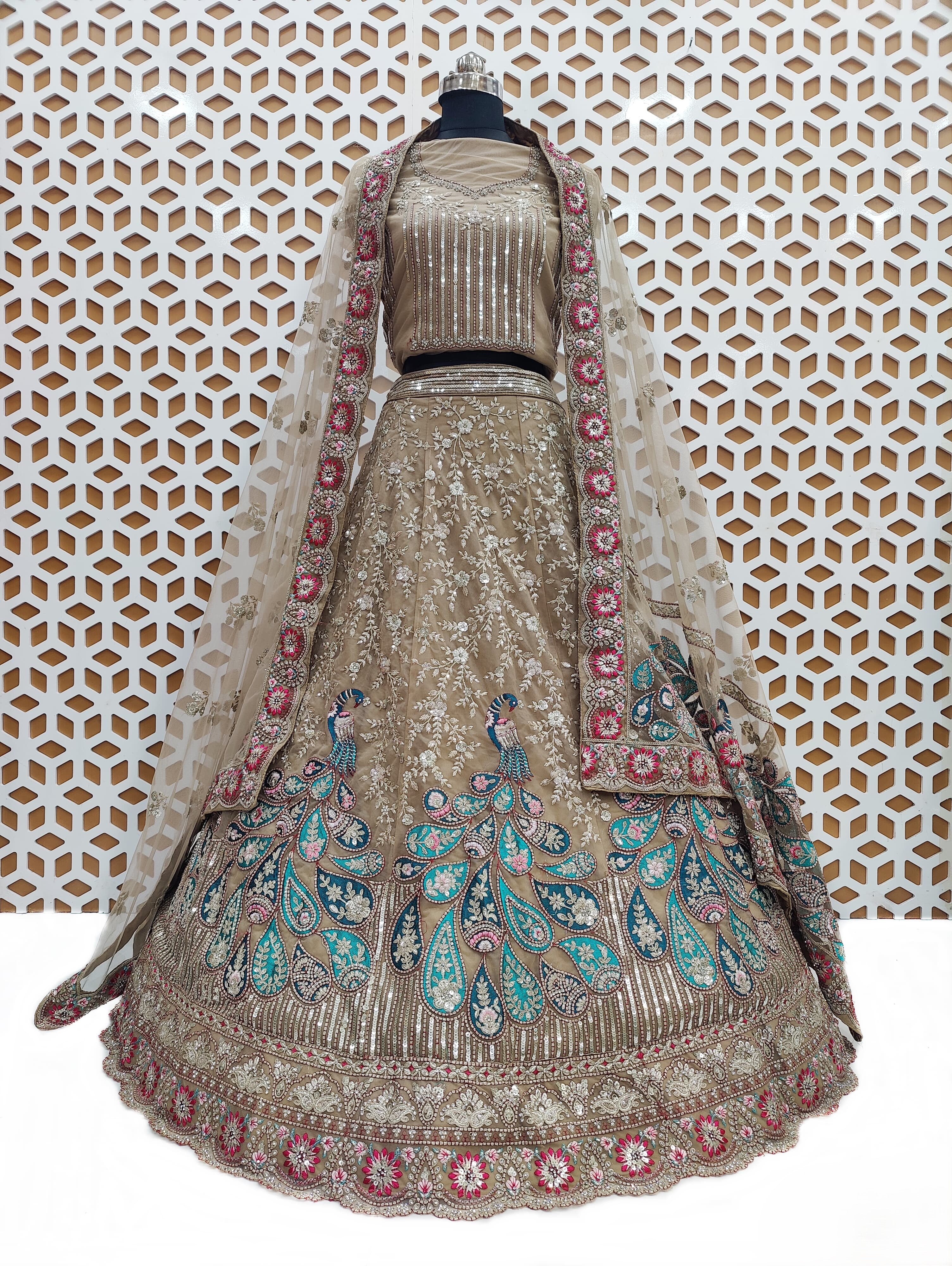 The Peacock Embroidery Design Net Lehenga is a luxurious, nature-inspired choice for those looking to make a bold, elegant statement at any special event.