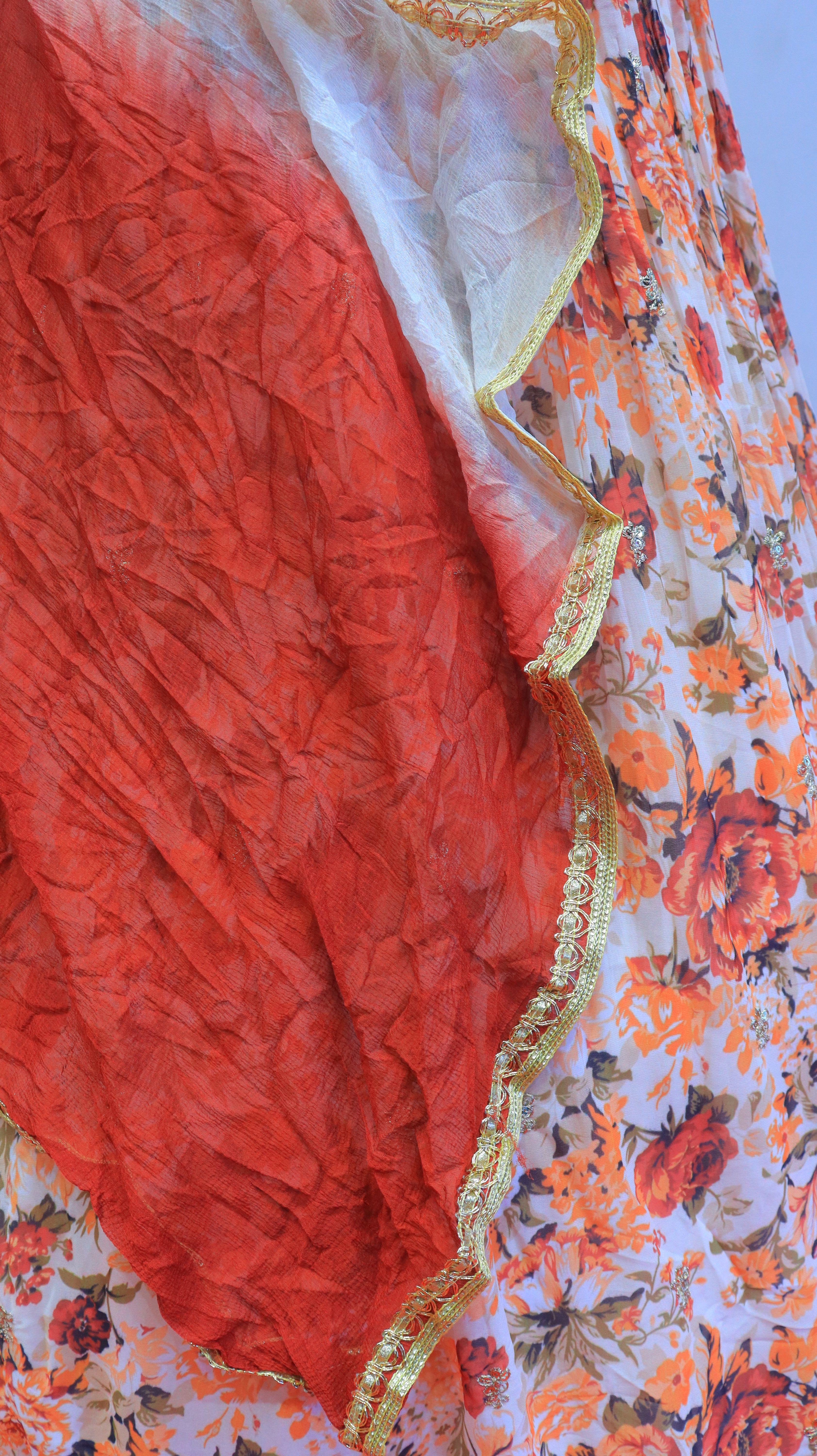 This stunning floral print gown is a perfect blend of elegance and femininity. The gown features a beautiful, vibrant floral print that adds a touch of nature’s charm, with soft, flowing fabric that drapes effortlessly to create a graceful silhouette. The delicate flowers in rich hues bring a sense of fresh beauty, making it ideal for any celebration or special occasion. Complementing the gown is a striking red dupatta, which adds a bold pop of color and enhances the overall look with its luxurious feel. Whether you're attending a wedding, a festive event, or a gathering, this gown, with its timeless appeal and sophisticated styling, will ensure you turn heads with effortless elegance.
