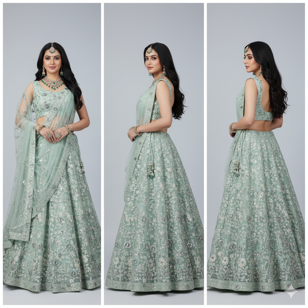 Embrace elegance and charm with the Teal Smoke Sea Green Embroidery Sequence Work Net Lehenga β an exquisite outfit that is sure to make you feel like royalty on your special day.