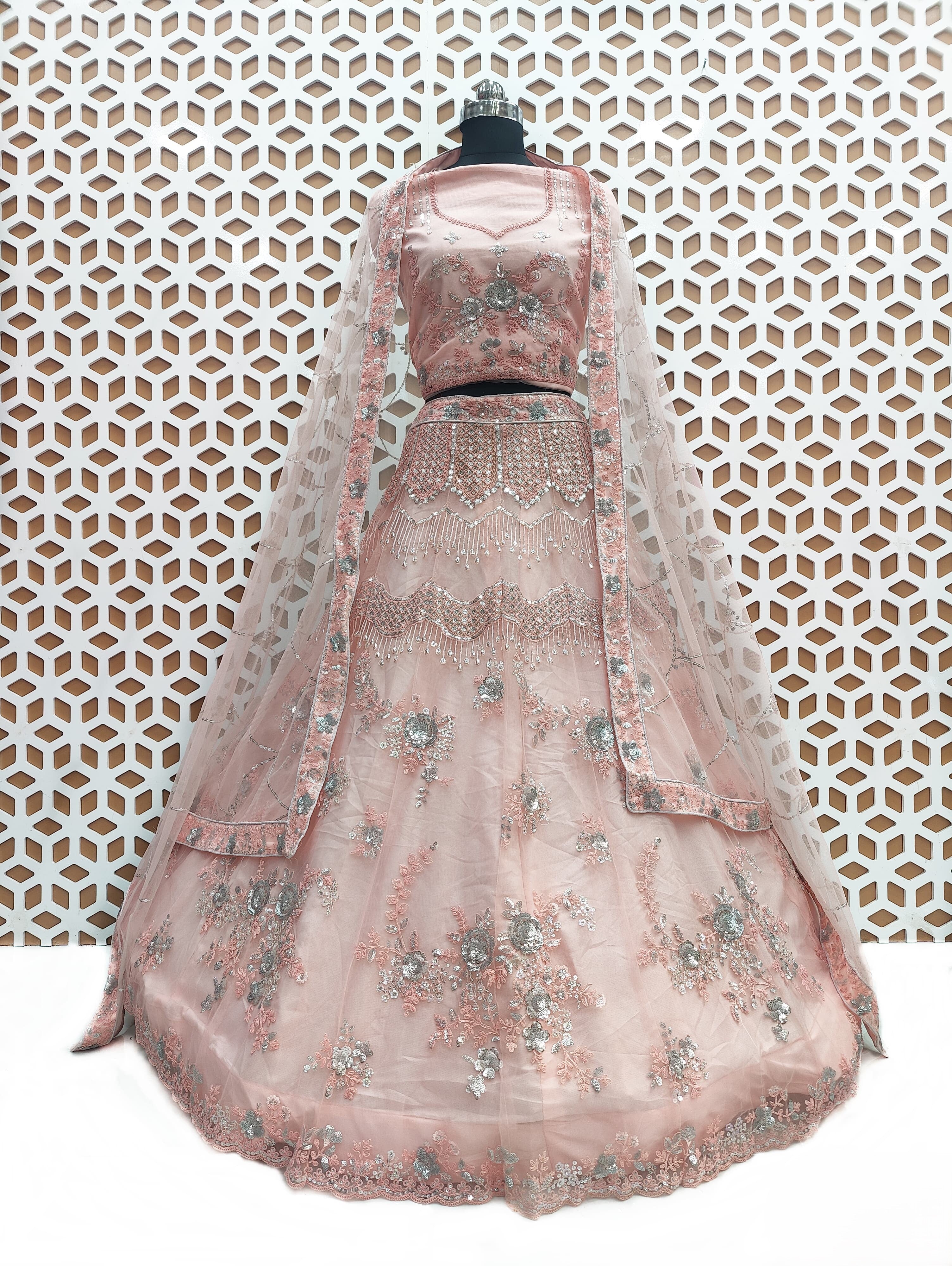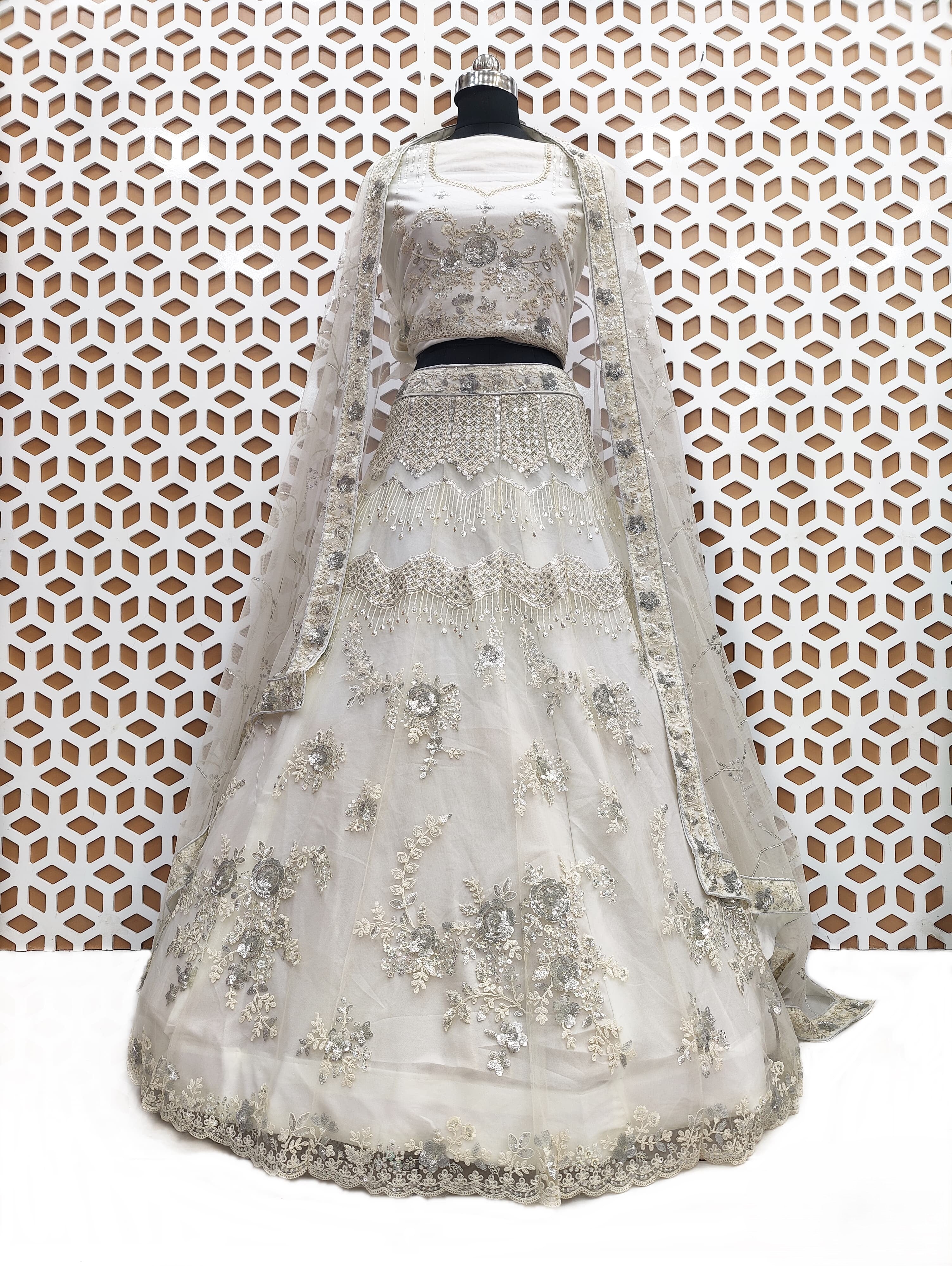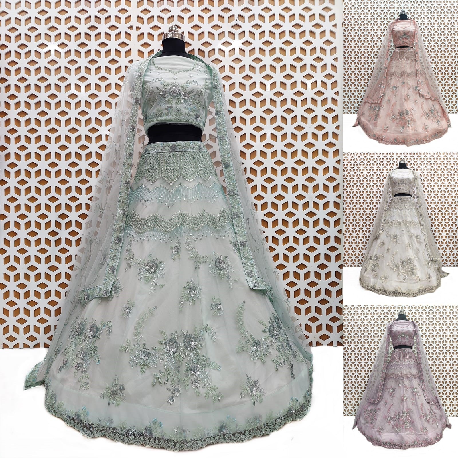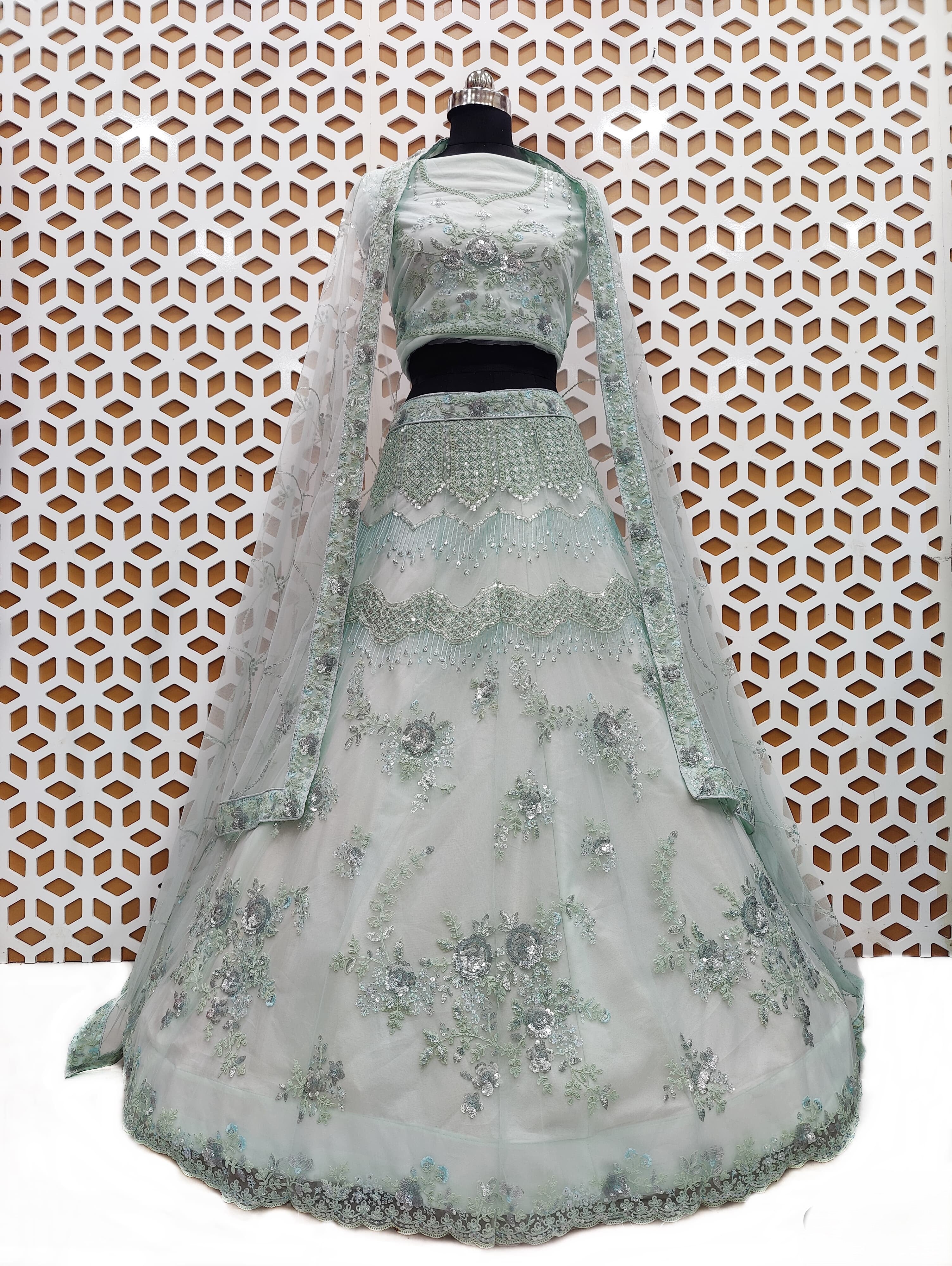 Embrace elegance and charm with the Teal Smoke Sea Green Embroidery Sequence Work Net Lehenga – an exquisite outfit that is sure to make you feel like royalty on your special day.
