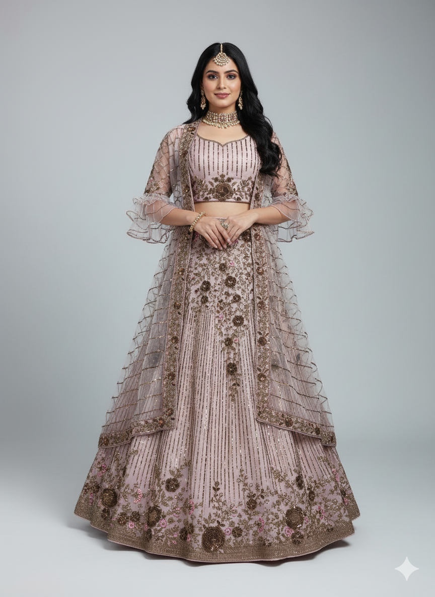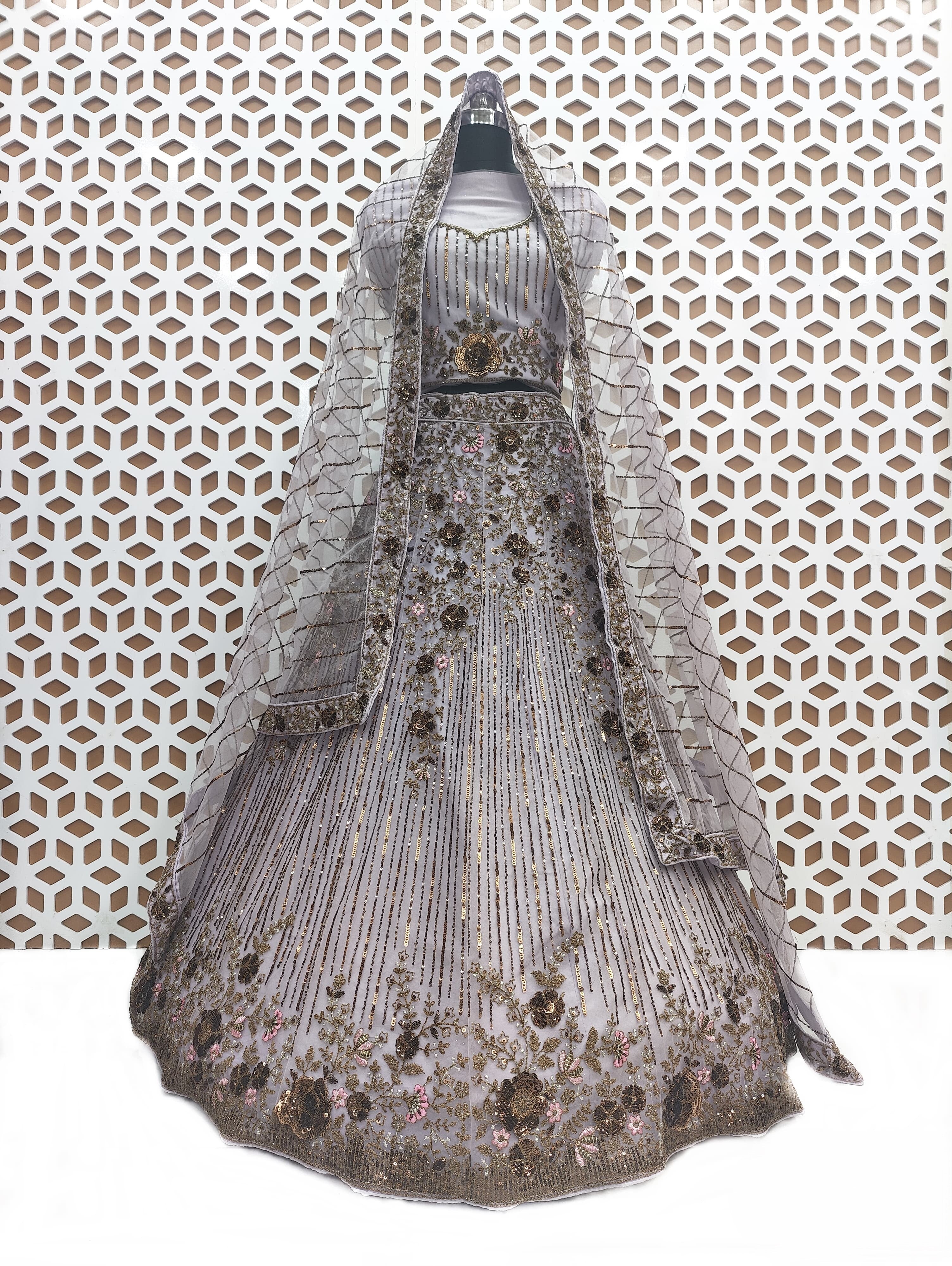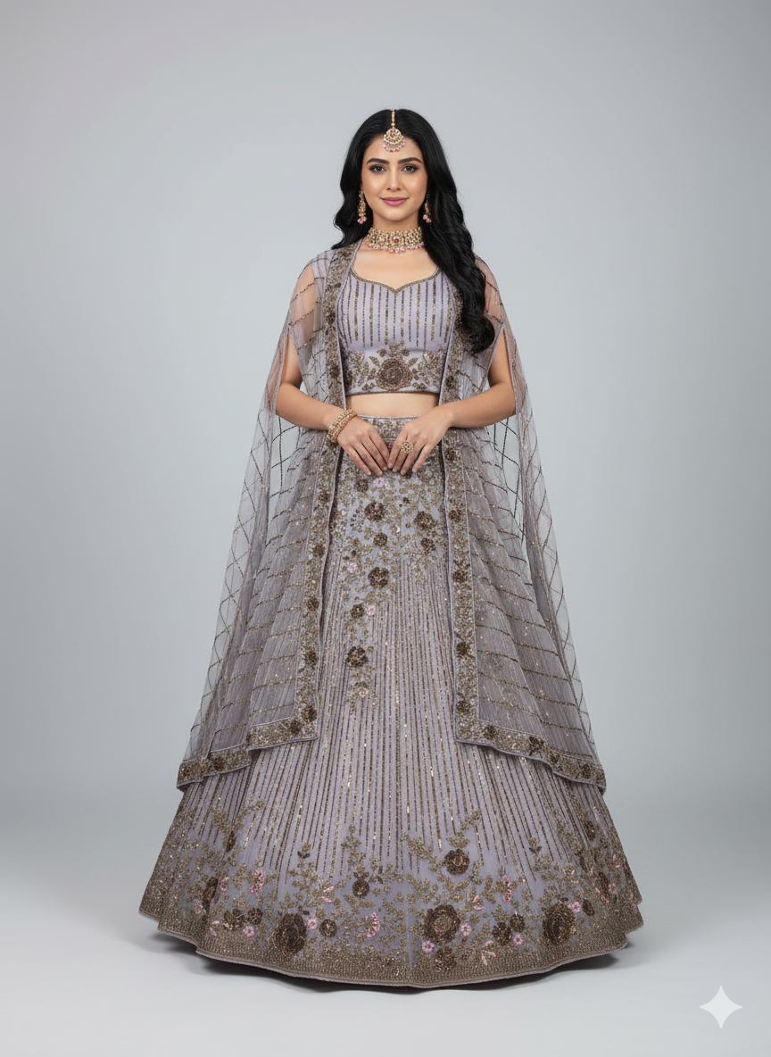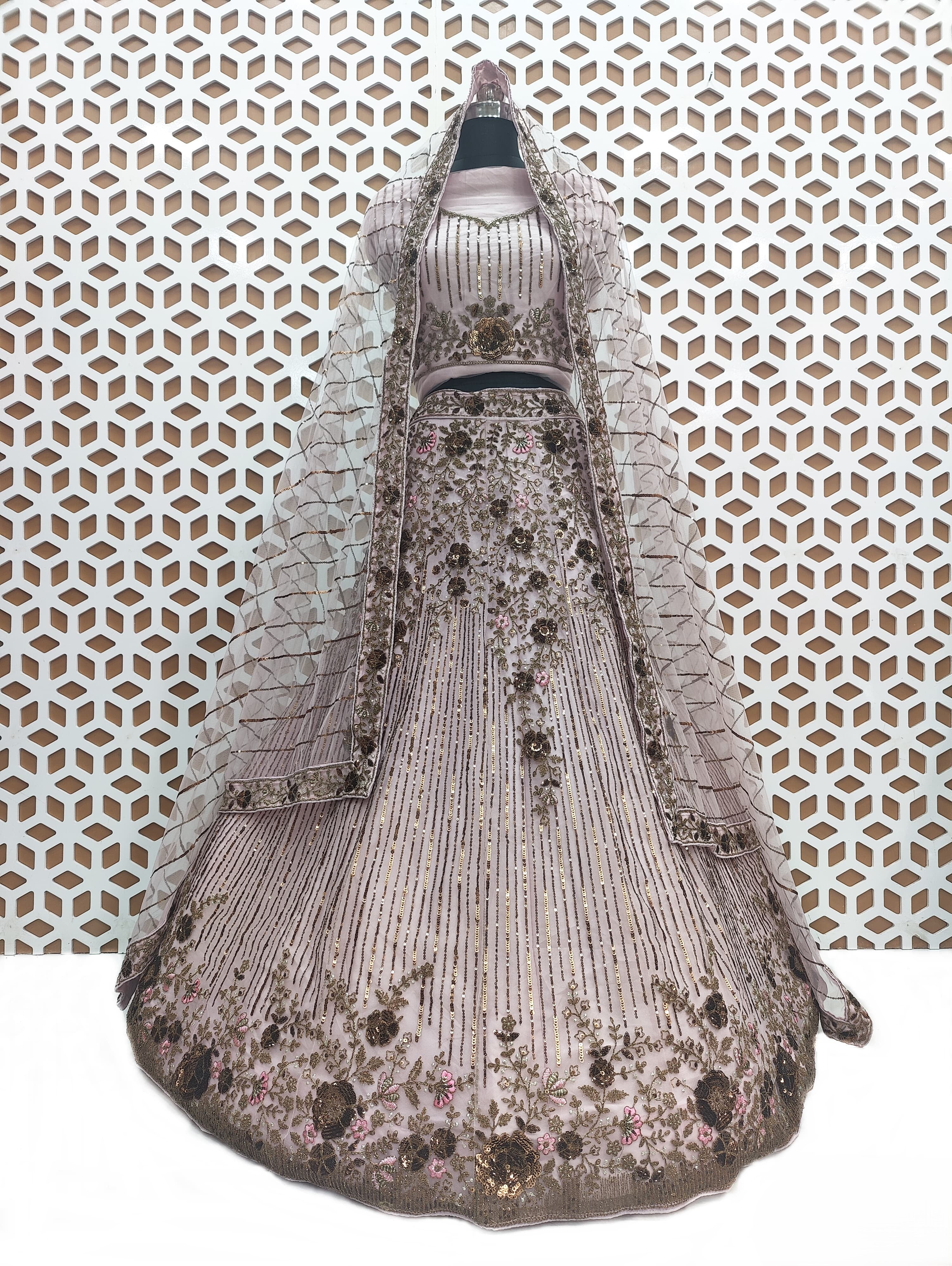 Crafted from fine net fabric, this lehenga offers both comfort and elegance, allowing for a graceful, lightweight feel that moves beautifully. The flared silhouette enhances the design, adding volume and creating a flattering shape, perfect for weddings, festive events, or any special celebration.