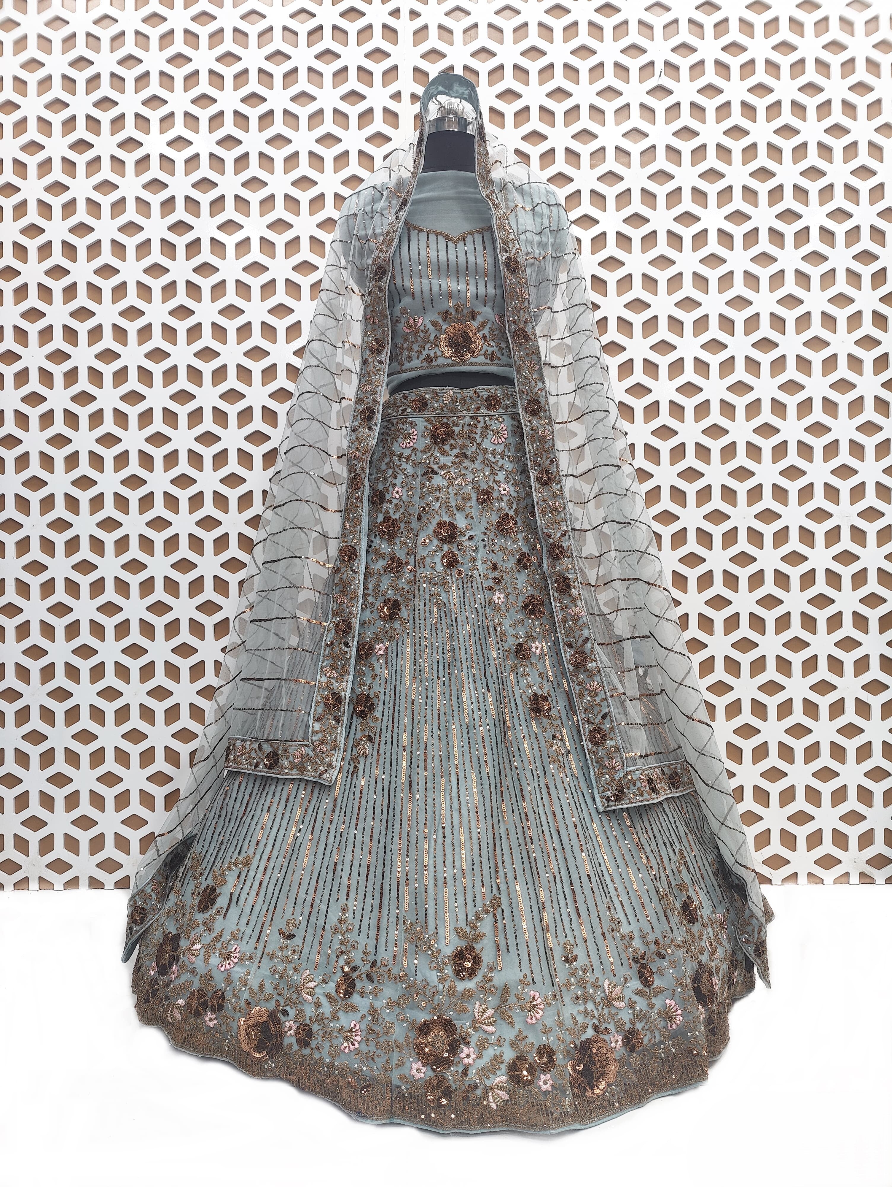 The Turquoise Sequence Work Net Lehenga is a perfect blend of luxury, tradition, and modern flair, designed to make a bold and sophisticated statement at your next special occasion.