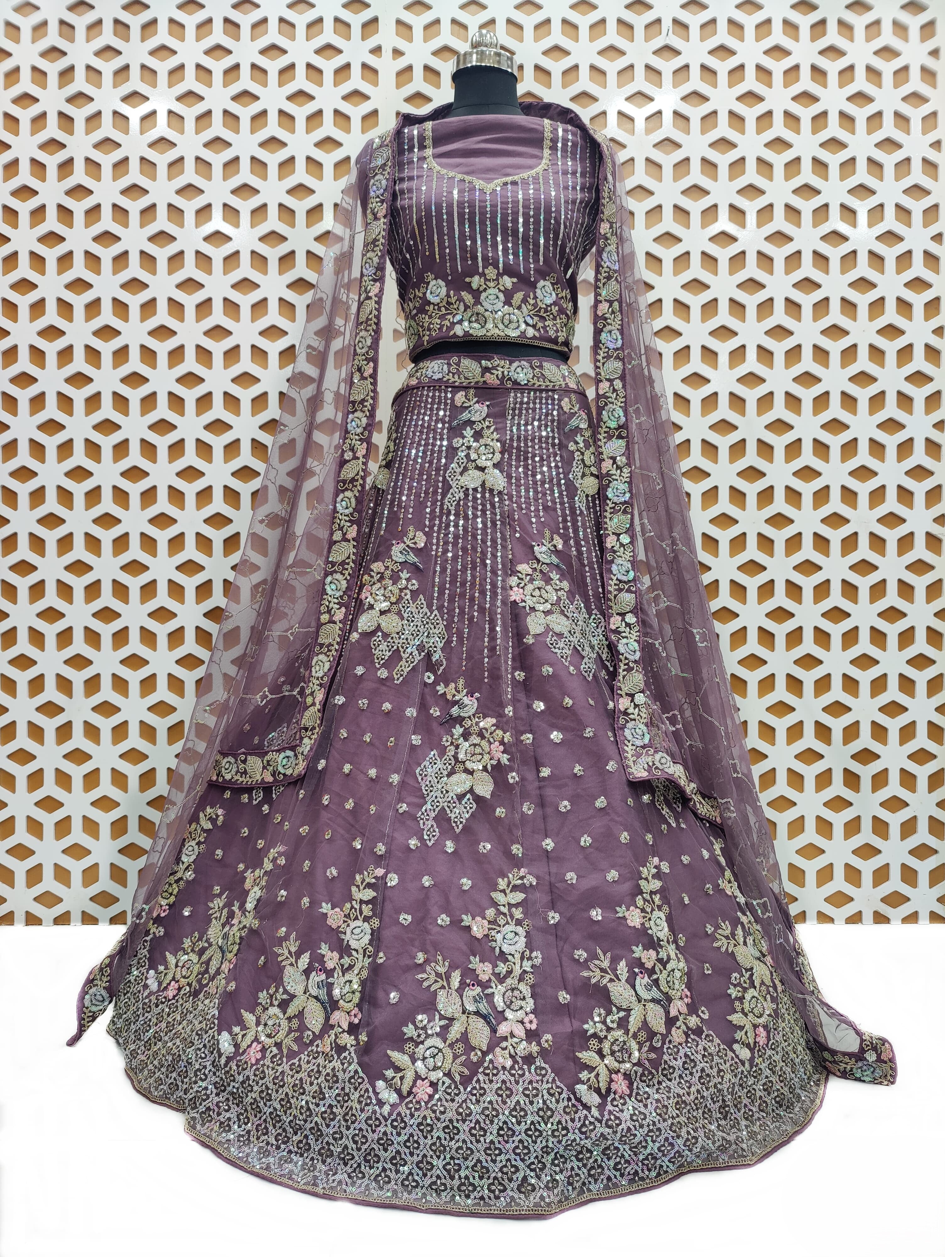 The Violet Sequence Nature Design Net Lehenga is a perfect choice for anyone looking to make a bold, sophisticated statement while embracing nature-inspired beauty and timeless elegance.