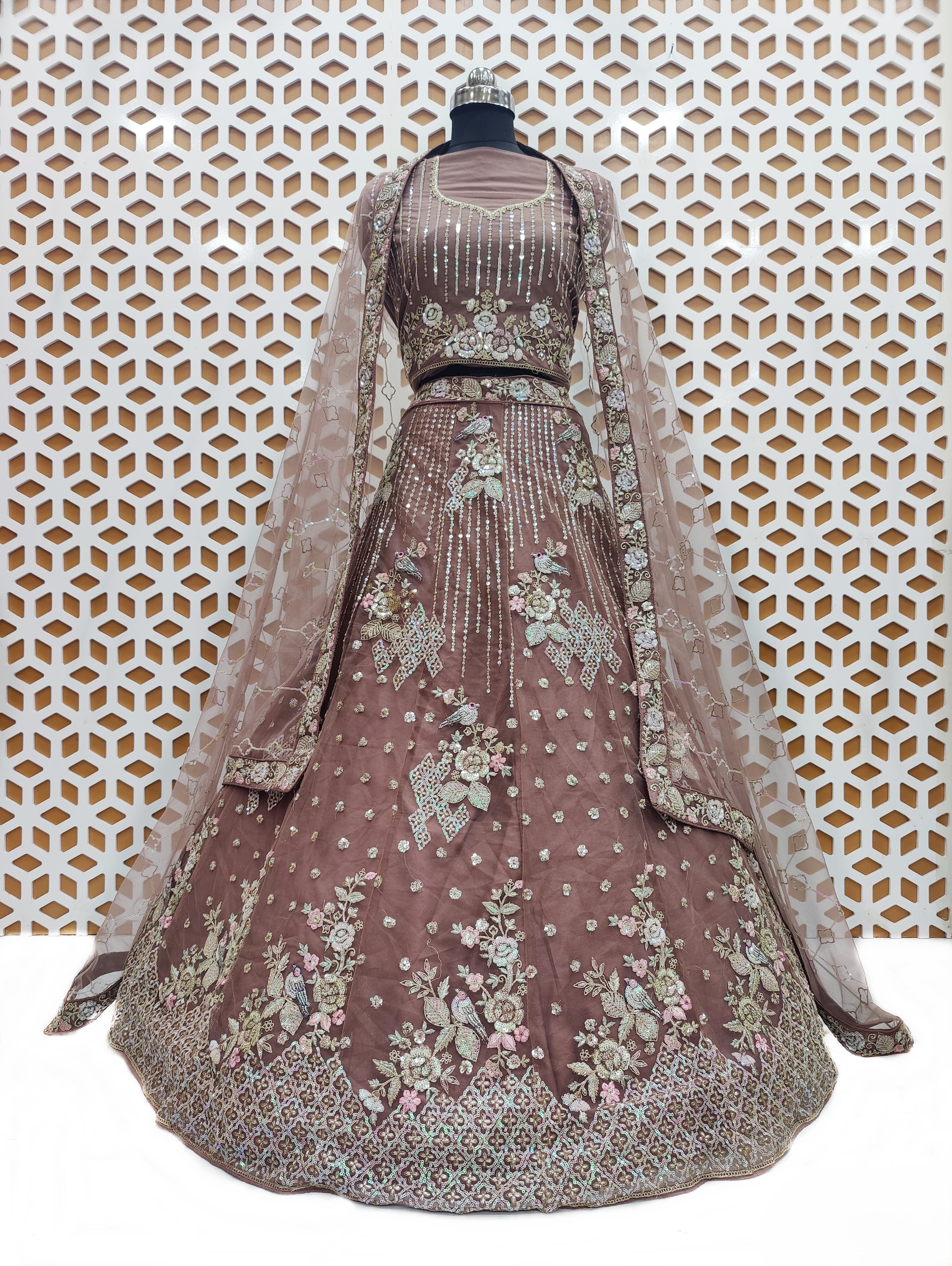 The sequence work enhances the entire design, adding a touch of sparkle that catches the light with every movement, creating a mesmerizing effect. Crafted from luxurious net fabric, the lehenga drapes beautifully and offers a comfortable, lightweight feel, allowing for graceful movement and a flattering silhouette.