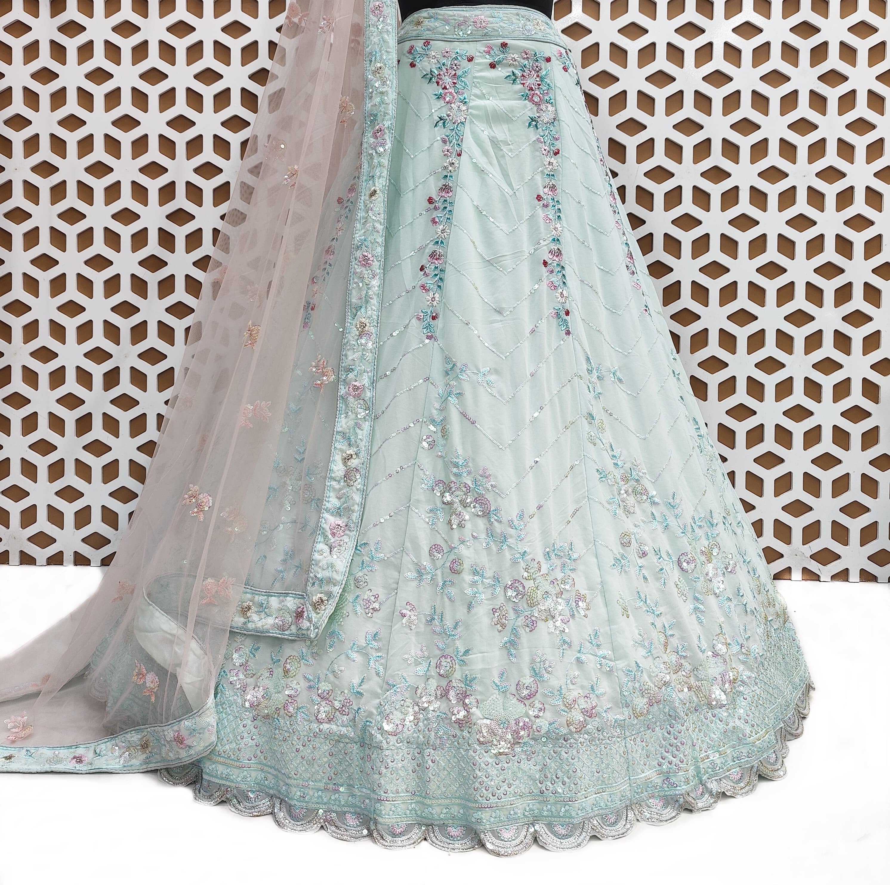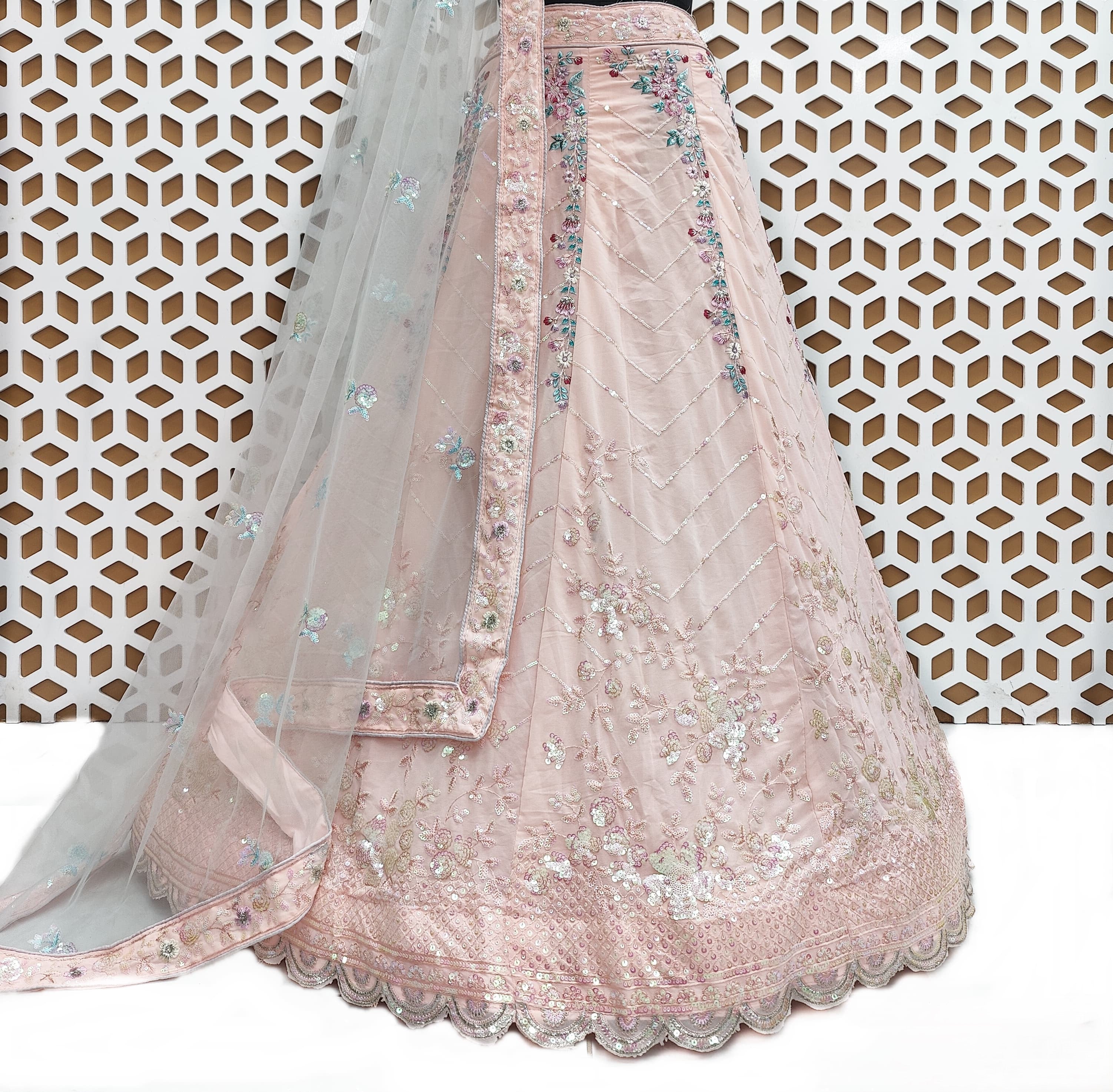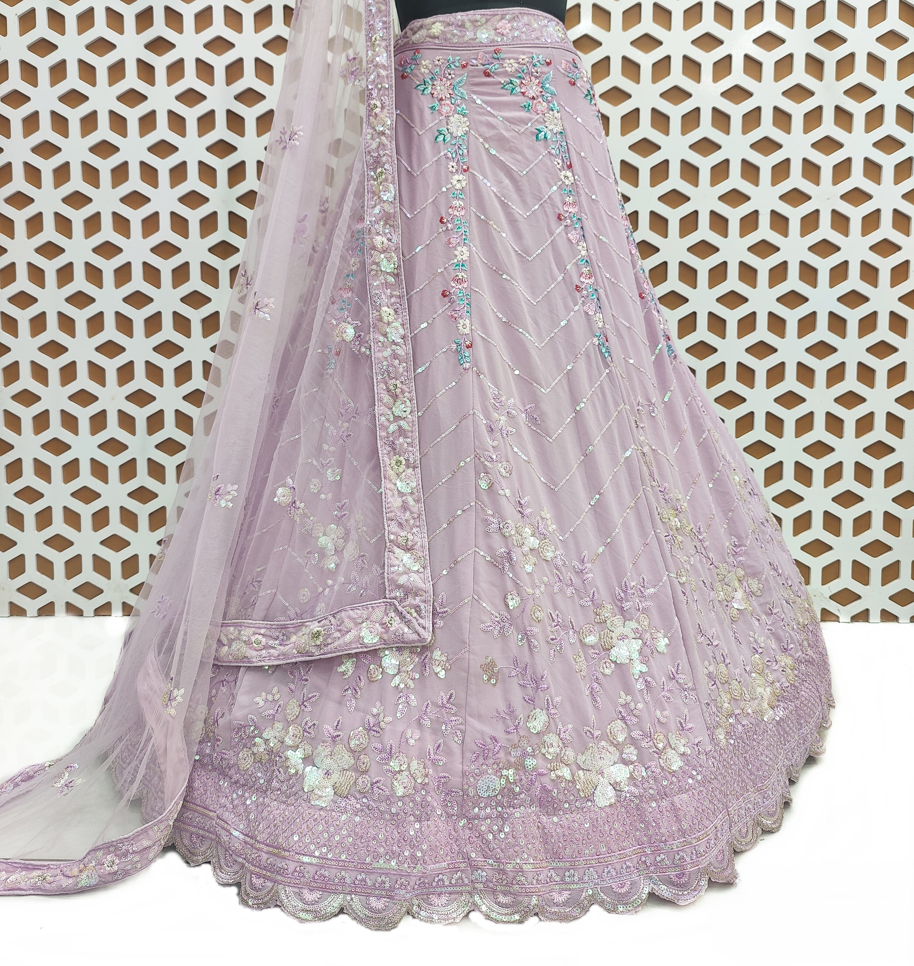 1. Fabric: The lehenga is usually crafted from net fabric, which gives it a light, airy feel and adds a delicate touch to the overall look. Net also allows intricate embroidery to stand out beautifully.