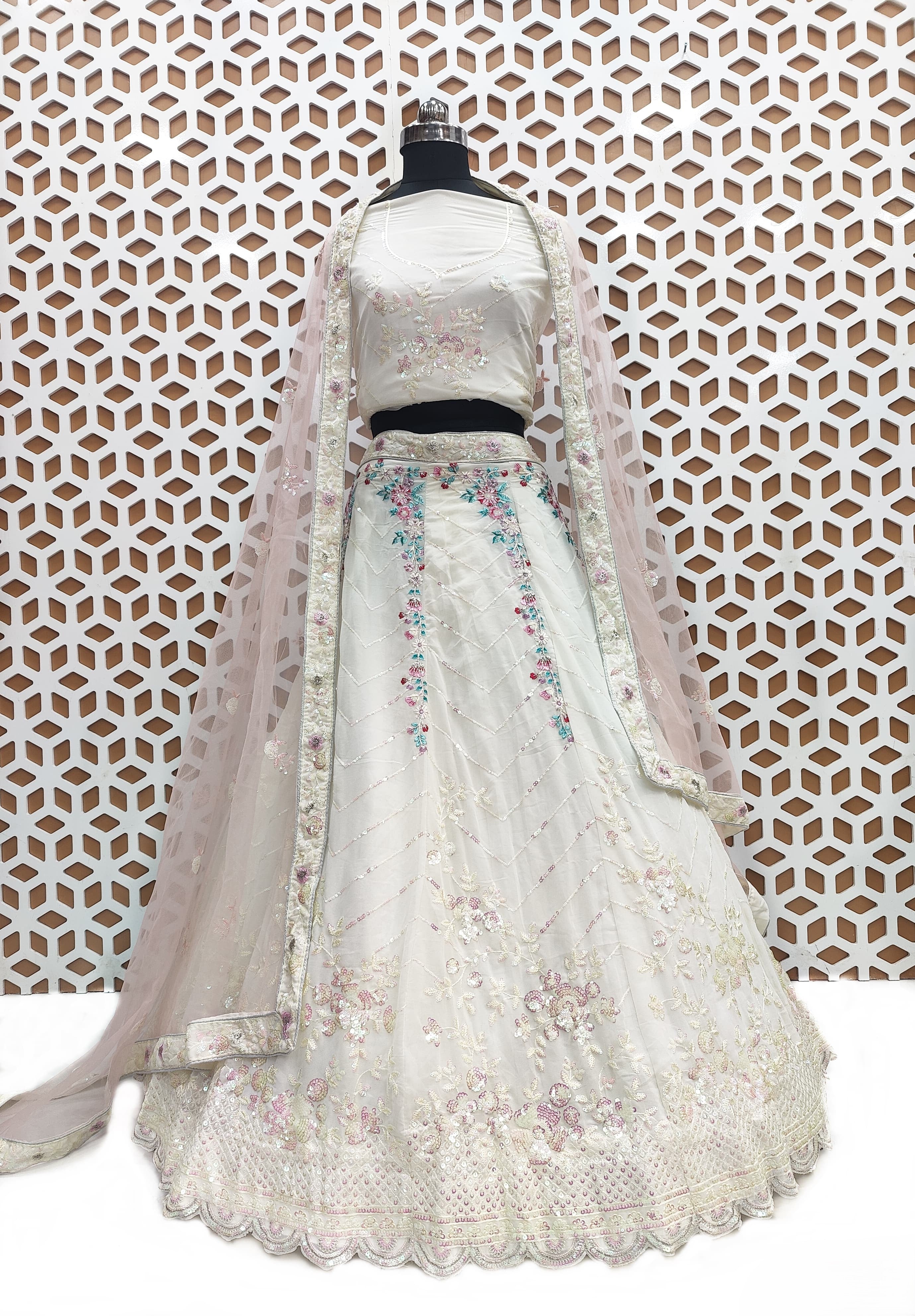 :- A white embroidery sequence work net lehenga is a stunning and elegant traditional outfit, often worn for weddings, receptions, or festive occasions. Here's what makes it special: