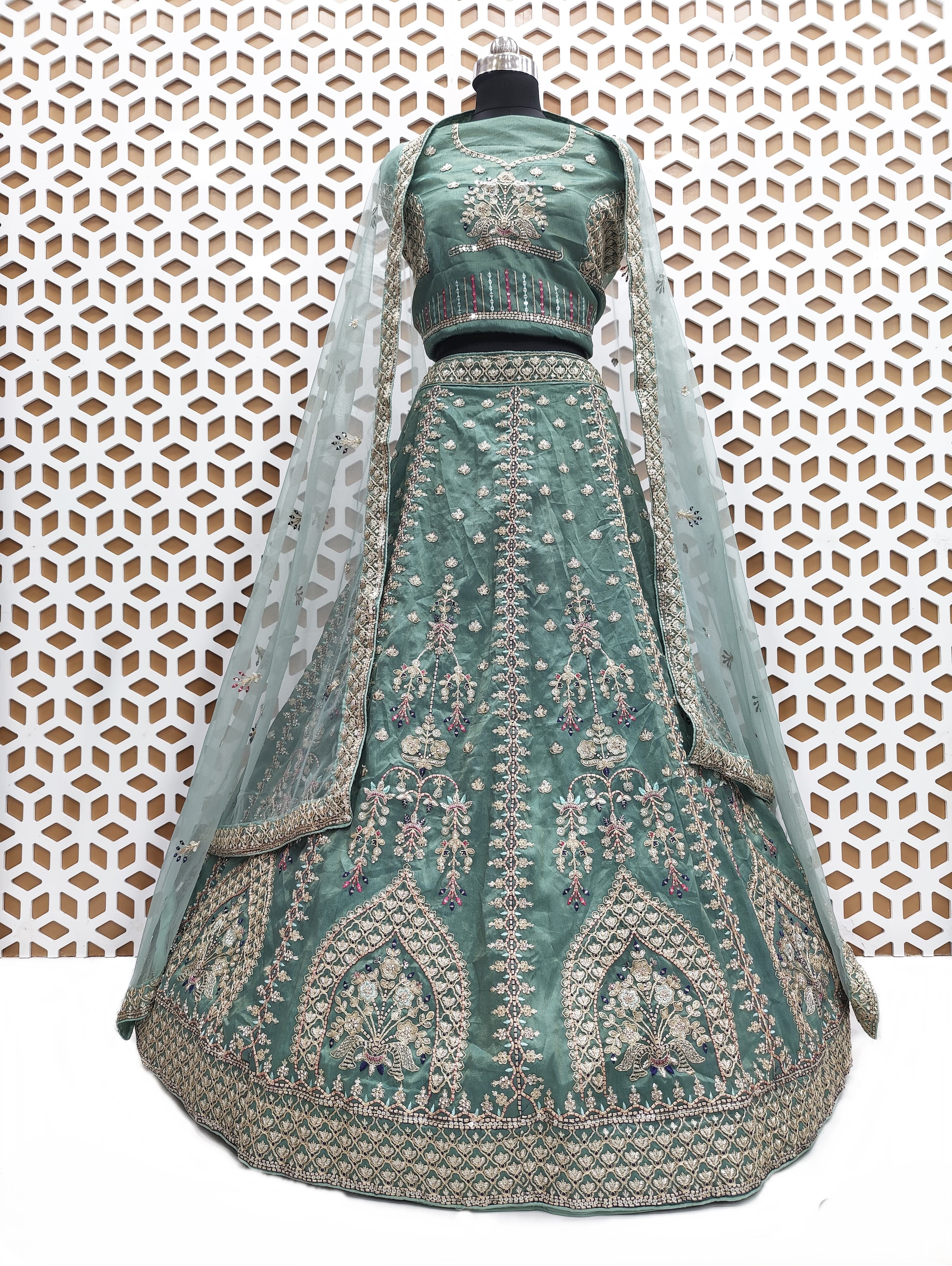 The lehenga is made from high-quality fabric that combines comfort with luxury, allowing for effortless movement and a flattering fit. Its flared silhouette creates a graceful flow, while the net dupatta adds an airy, ethereal touch, making this ensemble perfect for weddings, festive gatherings, or any special occasion.