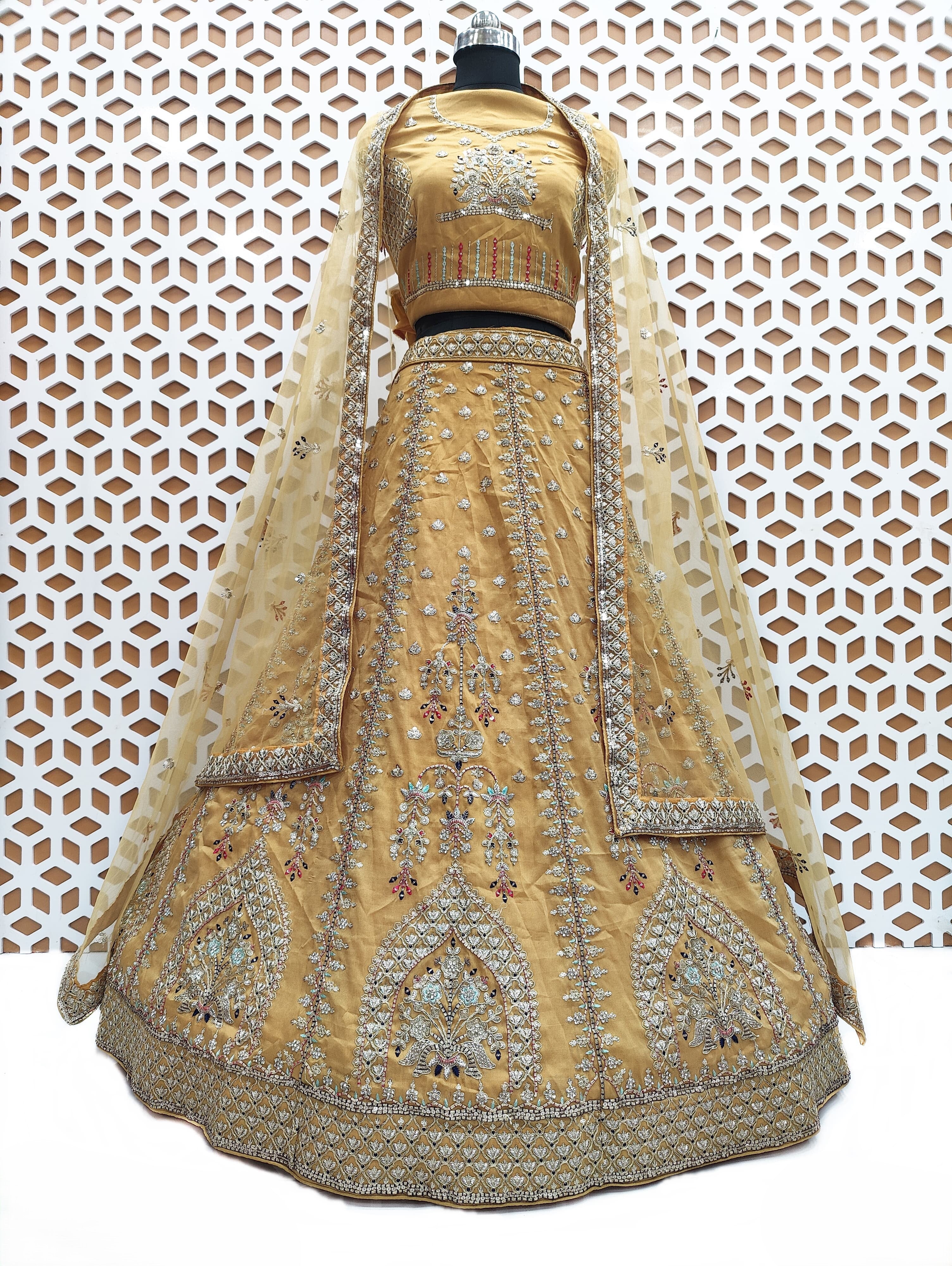 The Yellow Thread Work Sequence Lehenga with Net Dupatta is a stunning combination of tradition and modern elegance, ensuring you shine with beauty and grace at any special event.